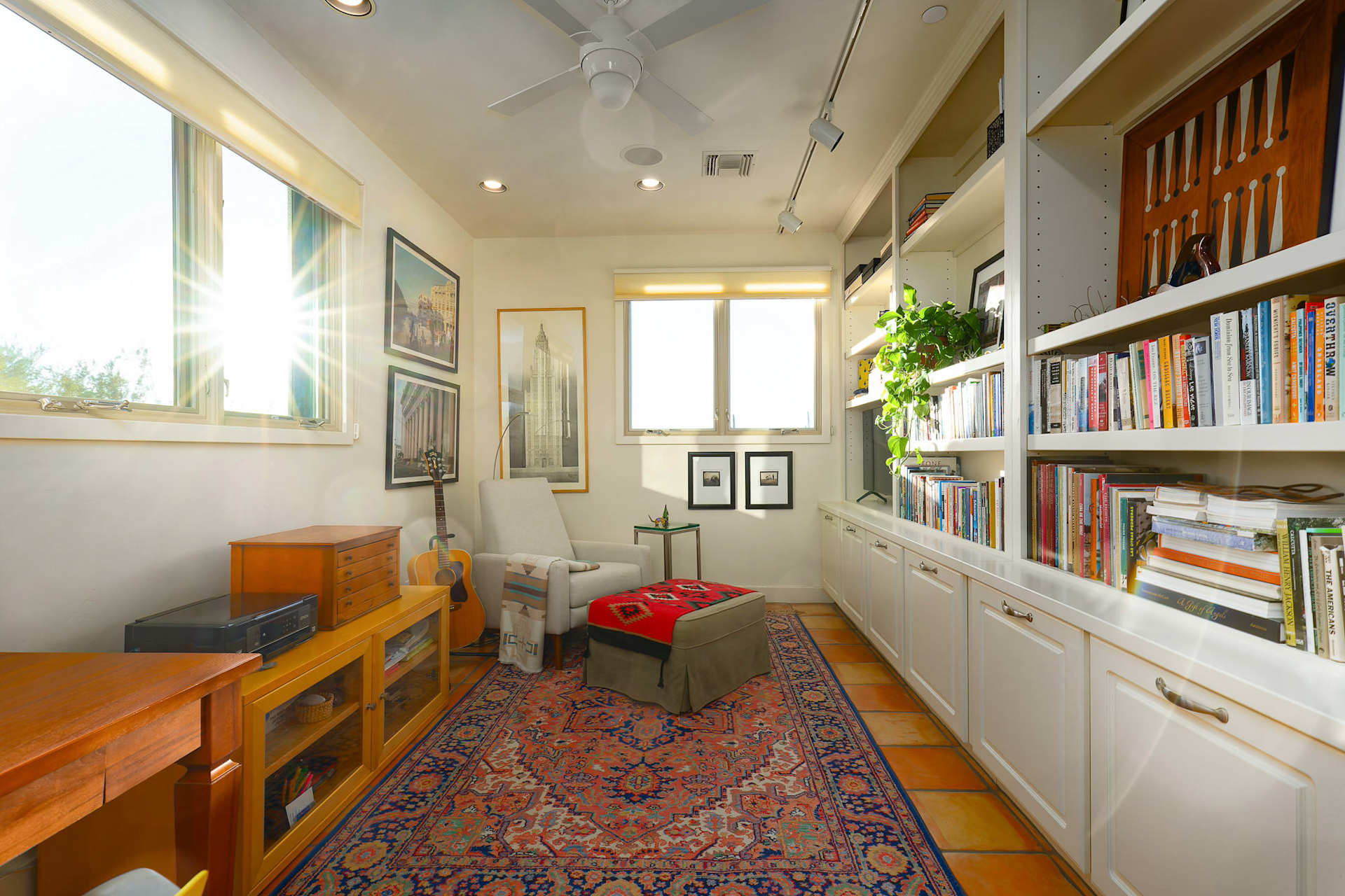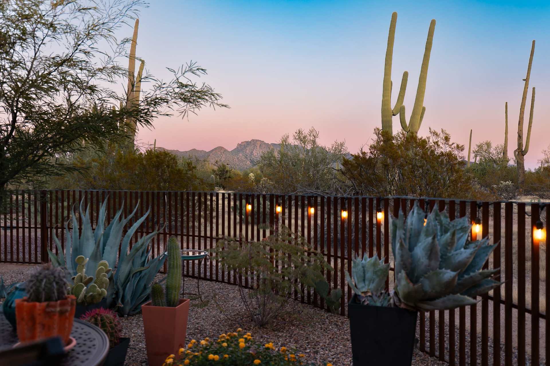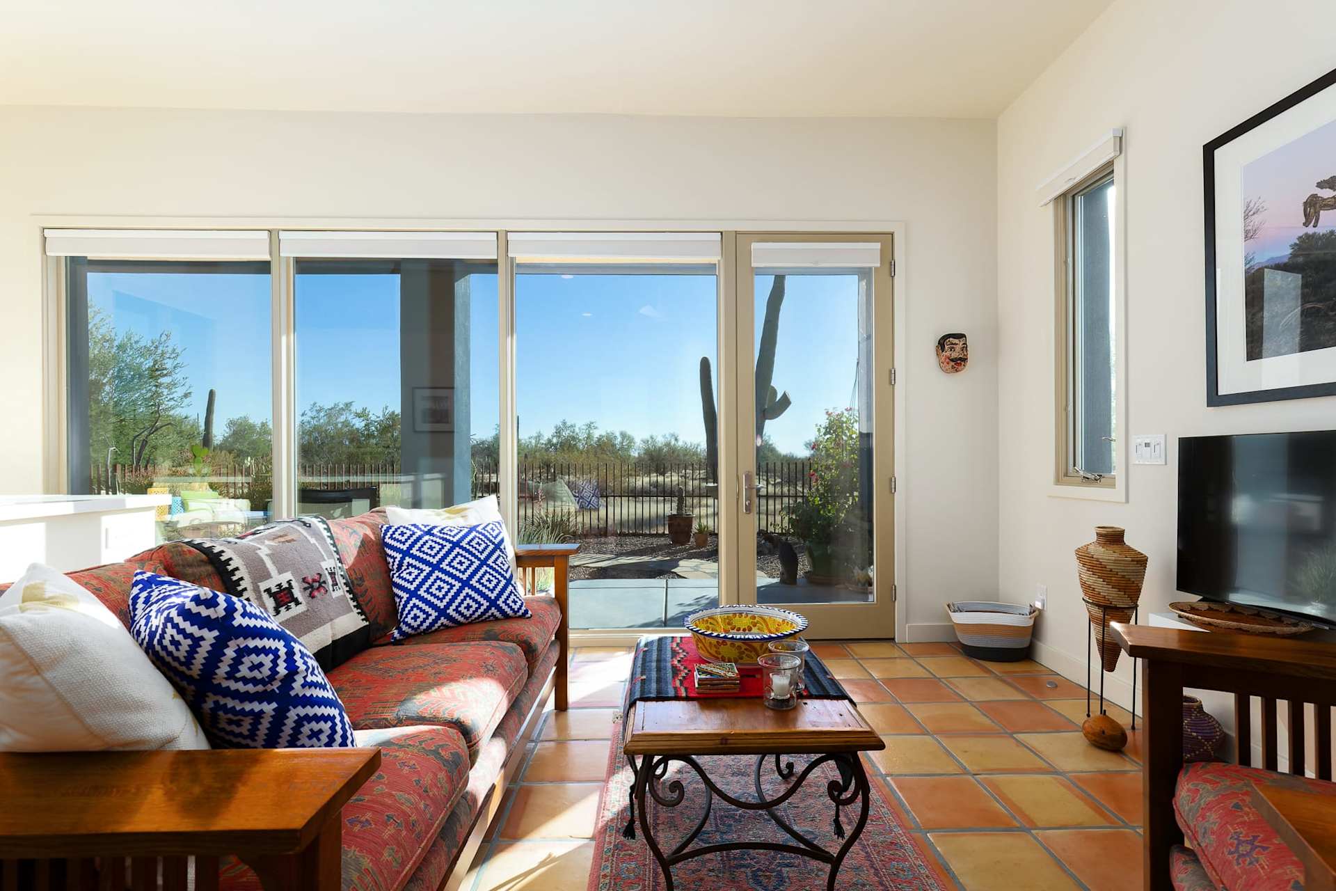 T: We have tried to push the house into a closer marriage of design and environment. We’ve added solar panels to an already super-efficient building and deployed water catchment and irrigation systems to support desert plants, trees, and shrubs inside and outside the fenced-in courtyards. The arrangement of plantings inside the courtyards has been precisely and artfully designed by Mary and the planting outside the living areas highlight and bolster the existing landscape.