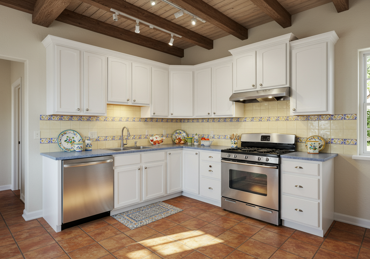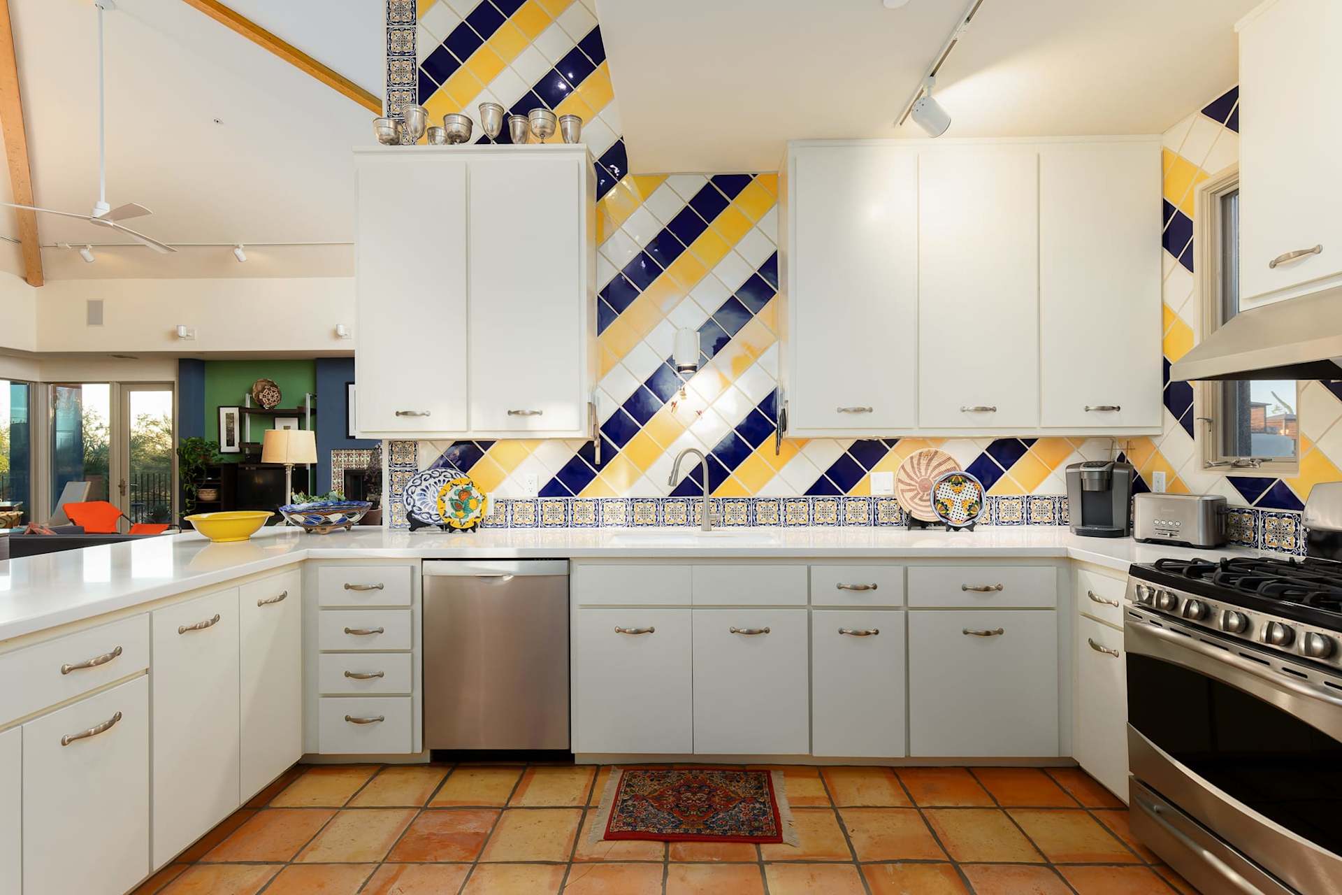 M: Honest, beautifully crafted materials. The Talavera tiles in this home never fail to astound me, to catch my eye, to cause me to wonder who the craftsperson was who patiently, repetitively created such beauty and detail. And I love the names of the solid-colored tiles: Marina, Crema, Sol, Saguaro. At once accurate and poetic. The Talavera sunflower pattern that encircles the sinks in the master then reappears in the spa edging tiles. Brilliant!