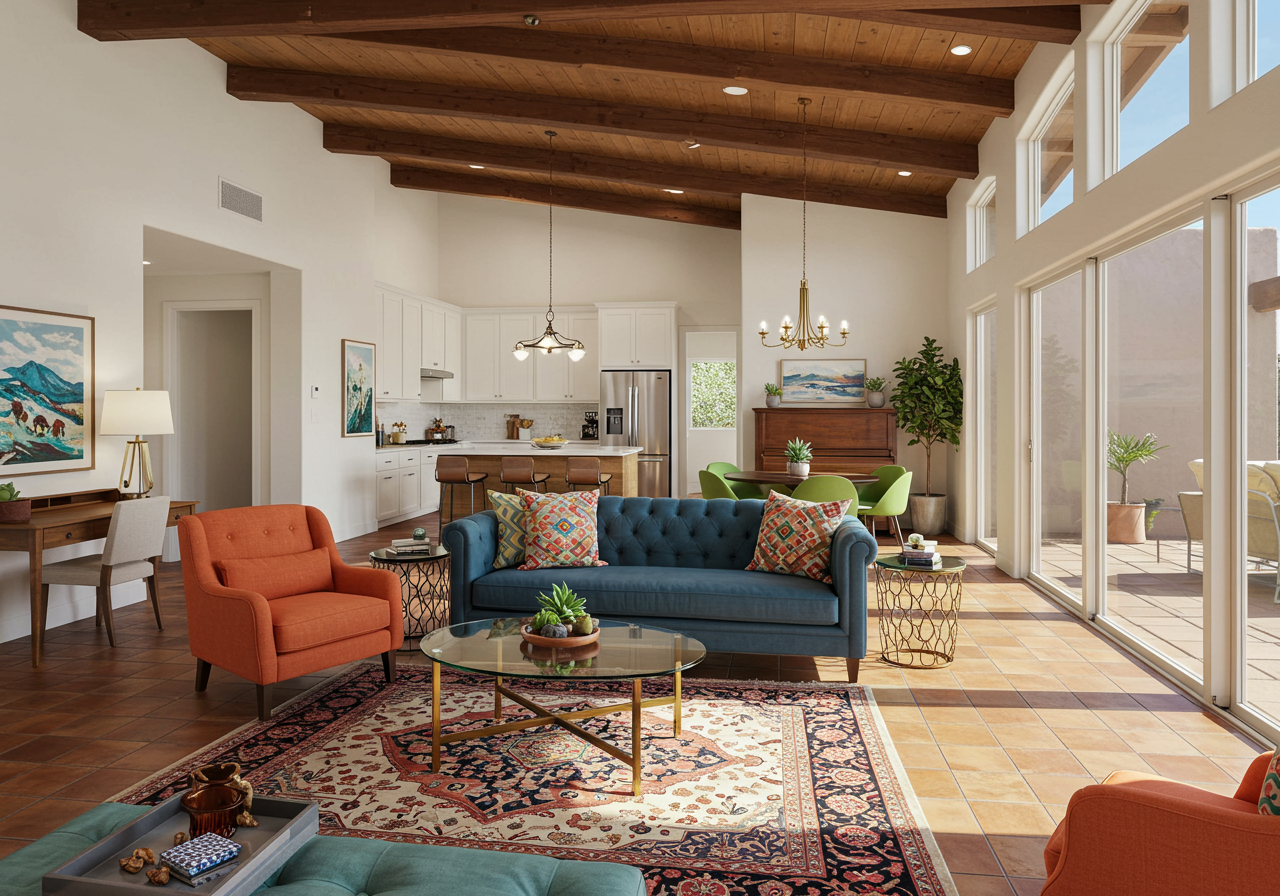 the great room is illuminated throughout the day due to window placement and the skylight in the center of the space