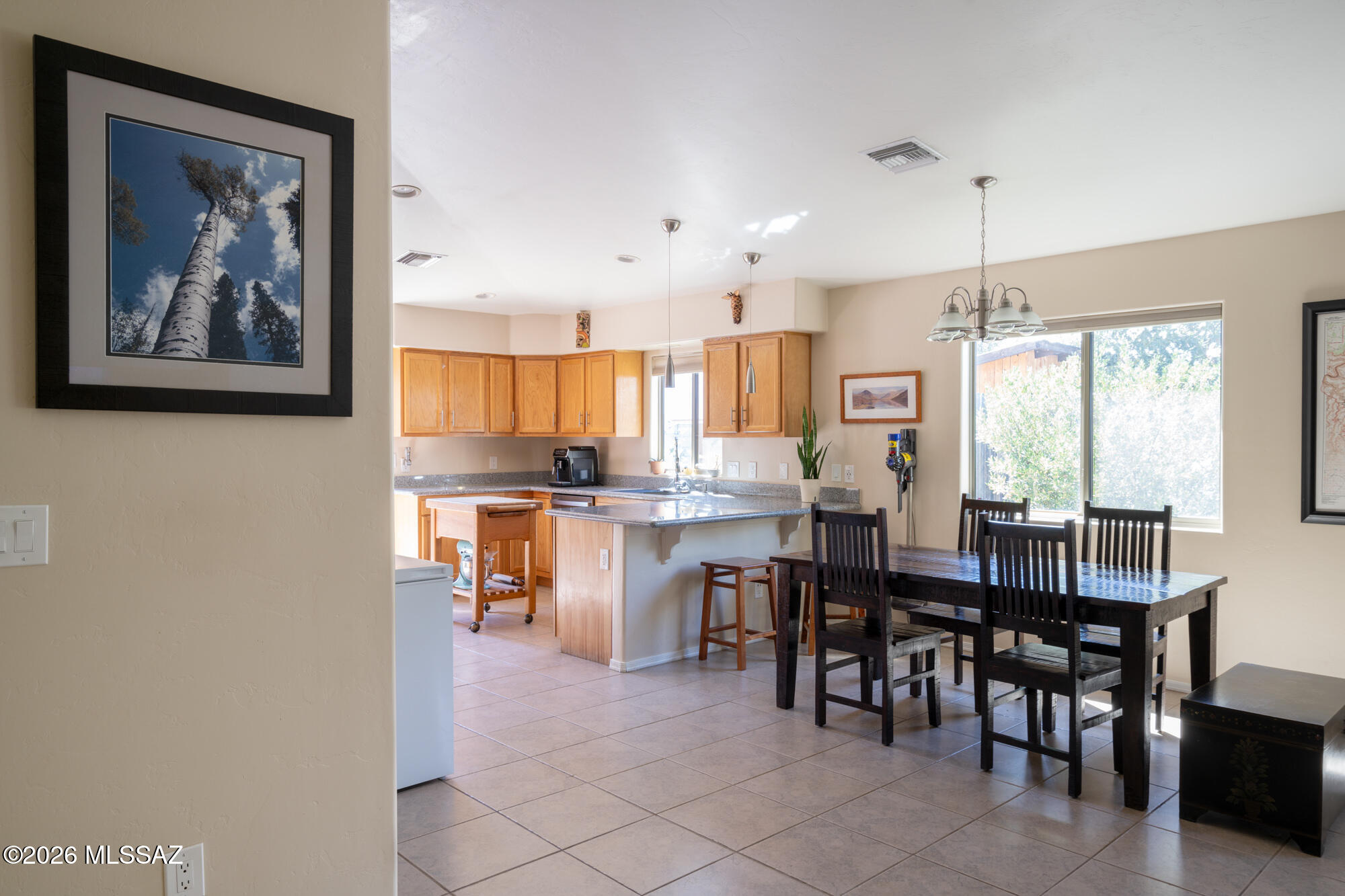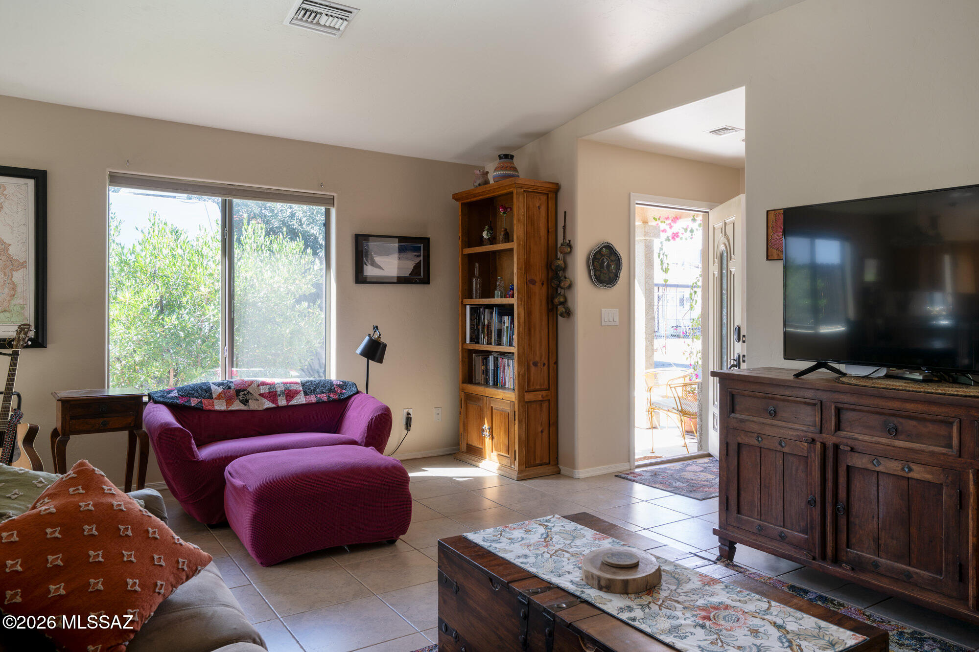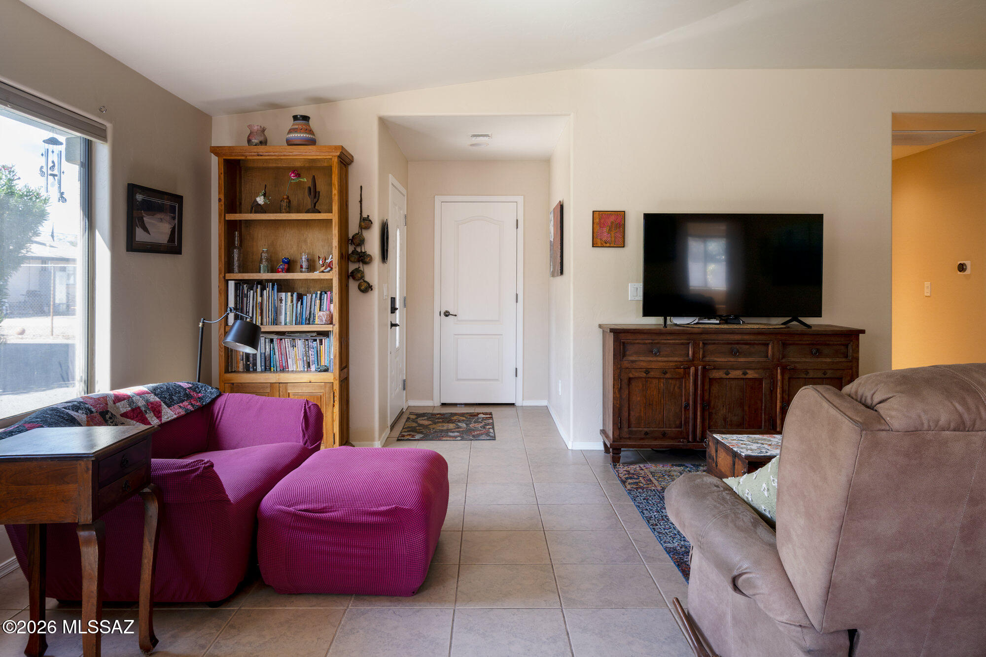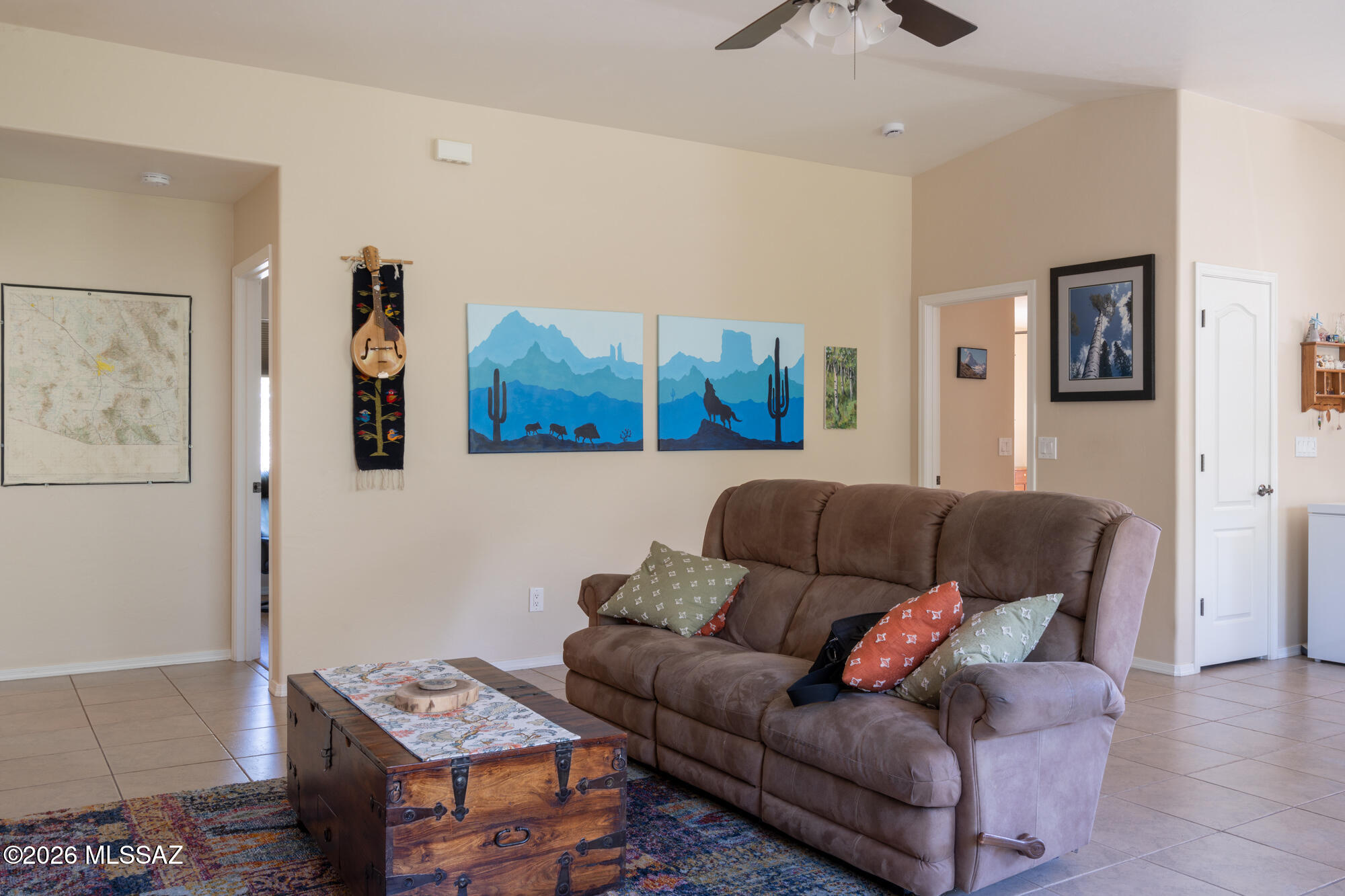 Private 3 bedroom, 2 bath home tucked away in a central Tucson location. Lofty ceilings in the great room and living room create a bright, open feel, while ceramic tile throughout and cork flooring in the bedrooms add comfort and function. The open living, dining, and kitchen layout works well for both everyday living and entertaining. The kitchen features generous cabinet storage, a pantry closet, granite countertops, and direct access to the yard. Bedrooms are nicely sized and well positioned off the main living area.
