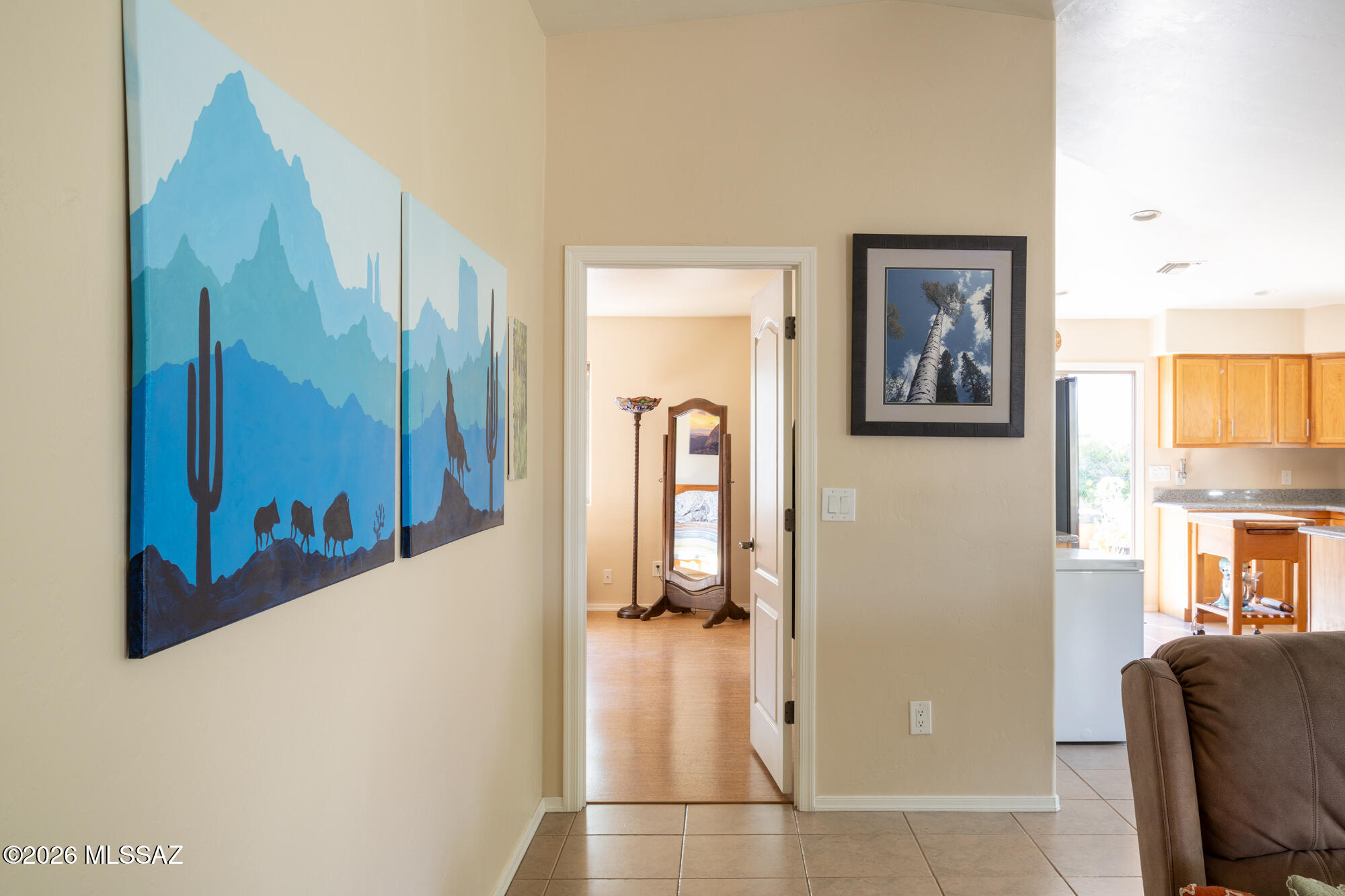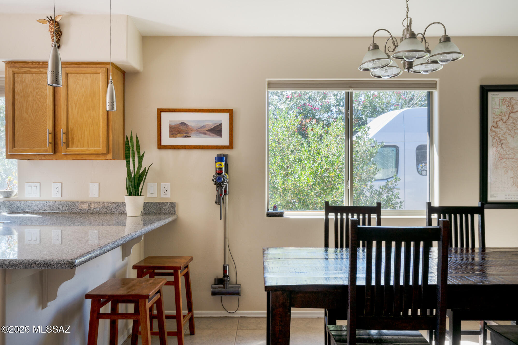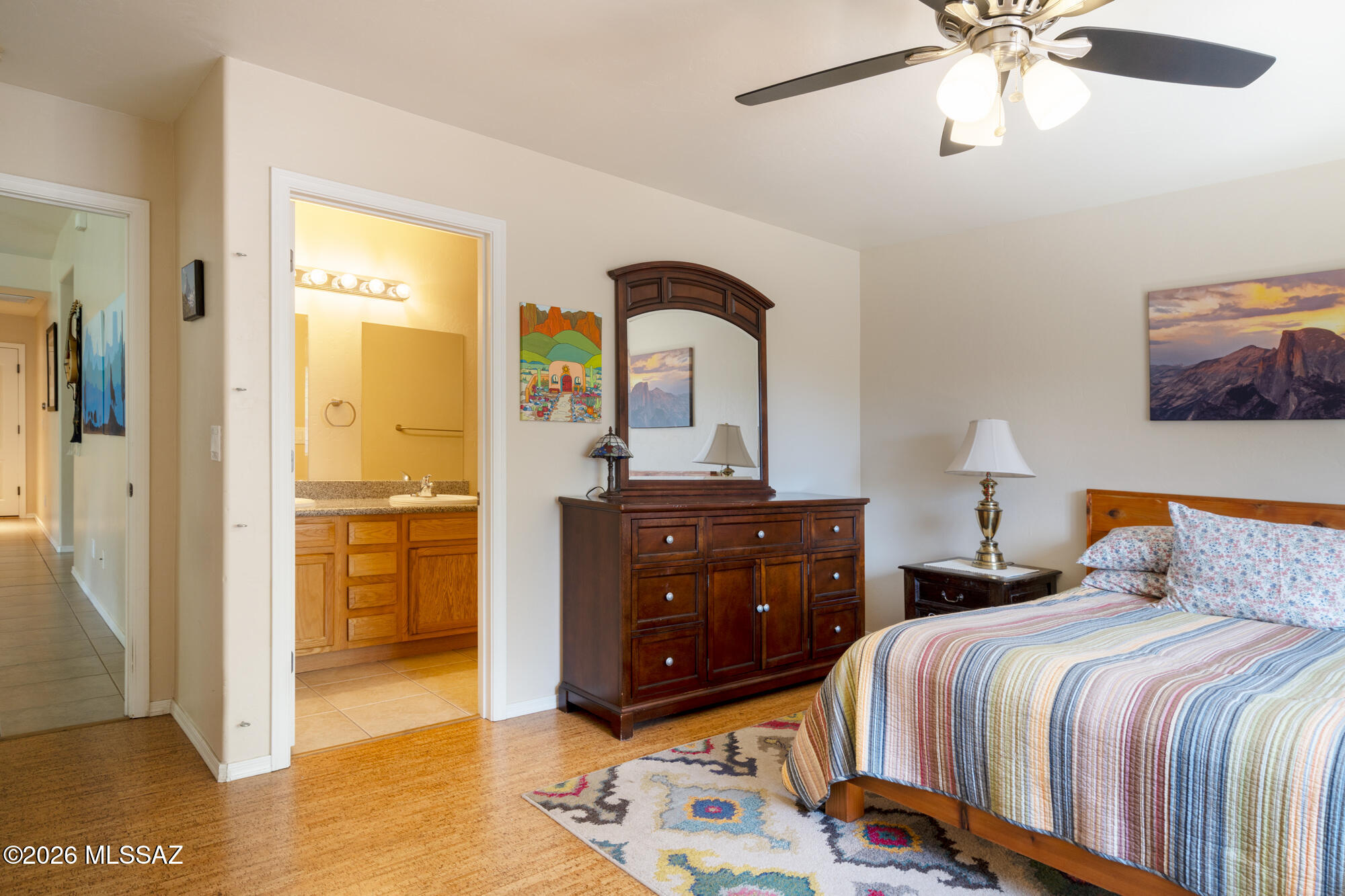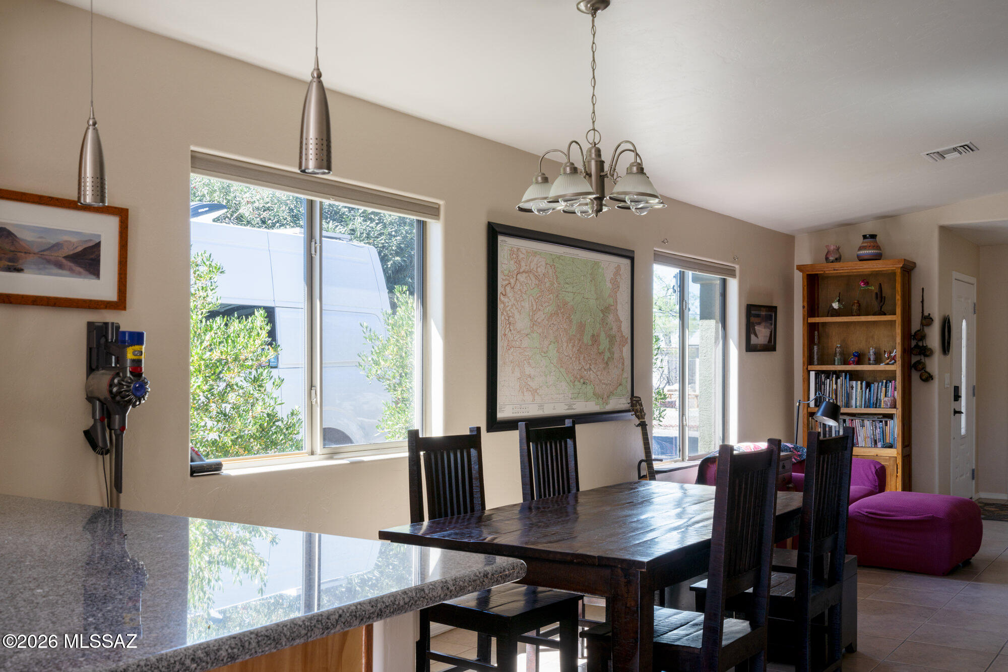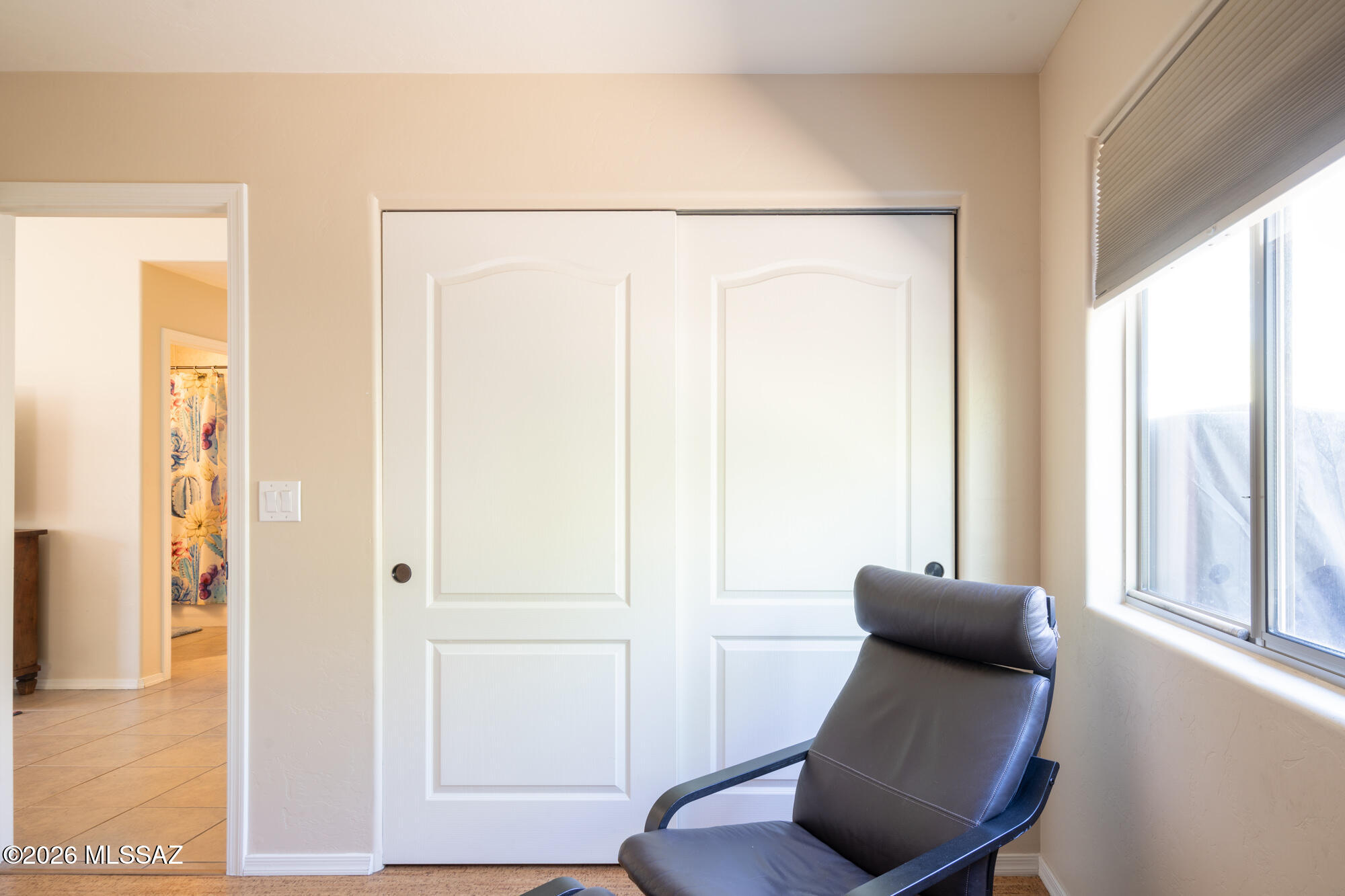 Private 3 bedroom, 2 bath home tucked away in a central Tucson location. Lofty ceilings in the great room and living room create a bright, open feel, while ceramic tile throughout and cork flooring in the bedrooms add comfort and function. The open living, dining, and kitchen layout works well for both everyday living and entertaining. The kitchen features generous cabinet storage, a pantry closet, granite countertops, and direct access to the yard. Bedrooms are nicely sized and well positioned off the main living area.