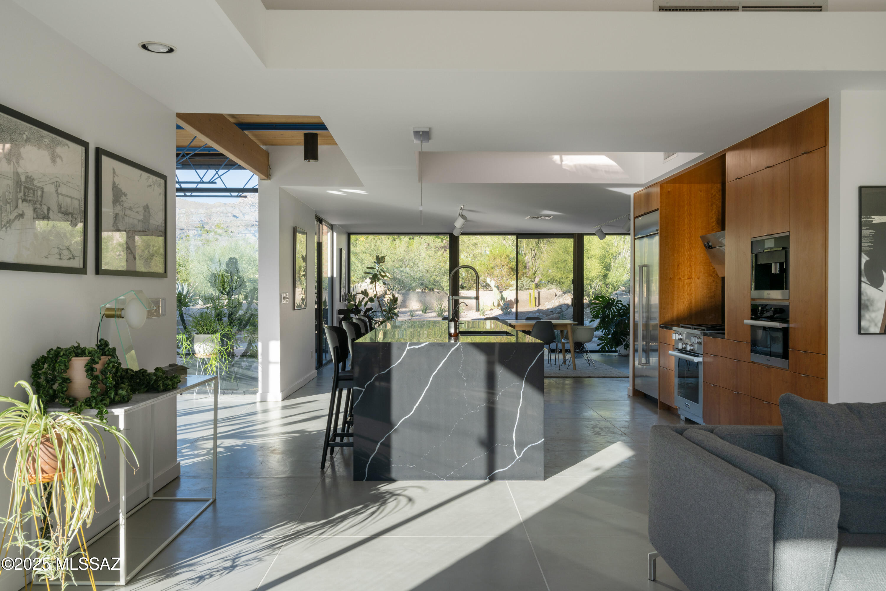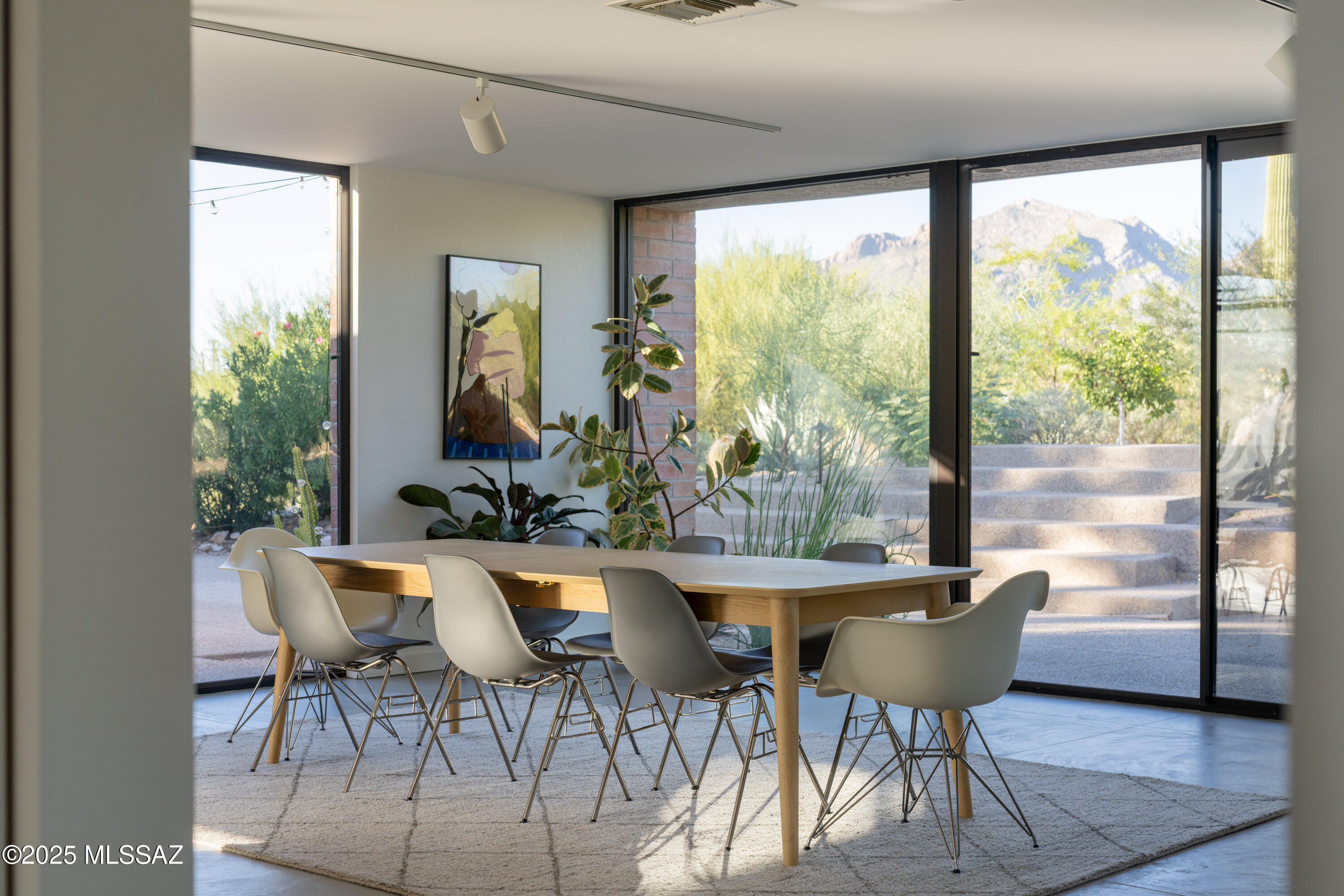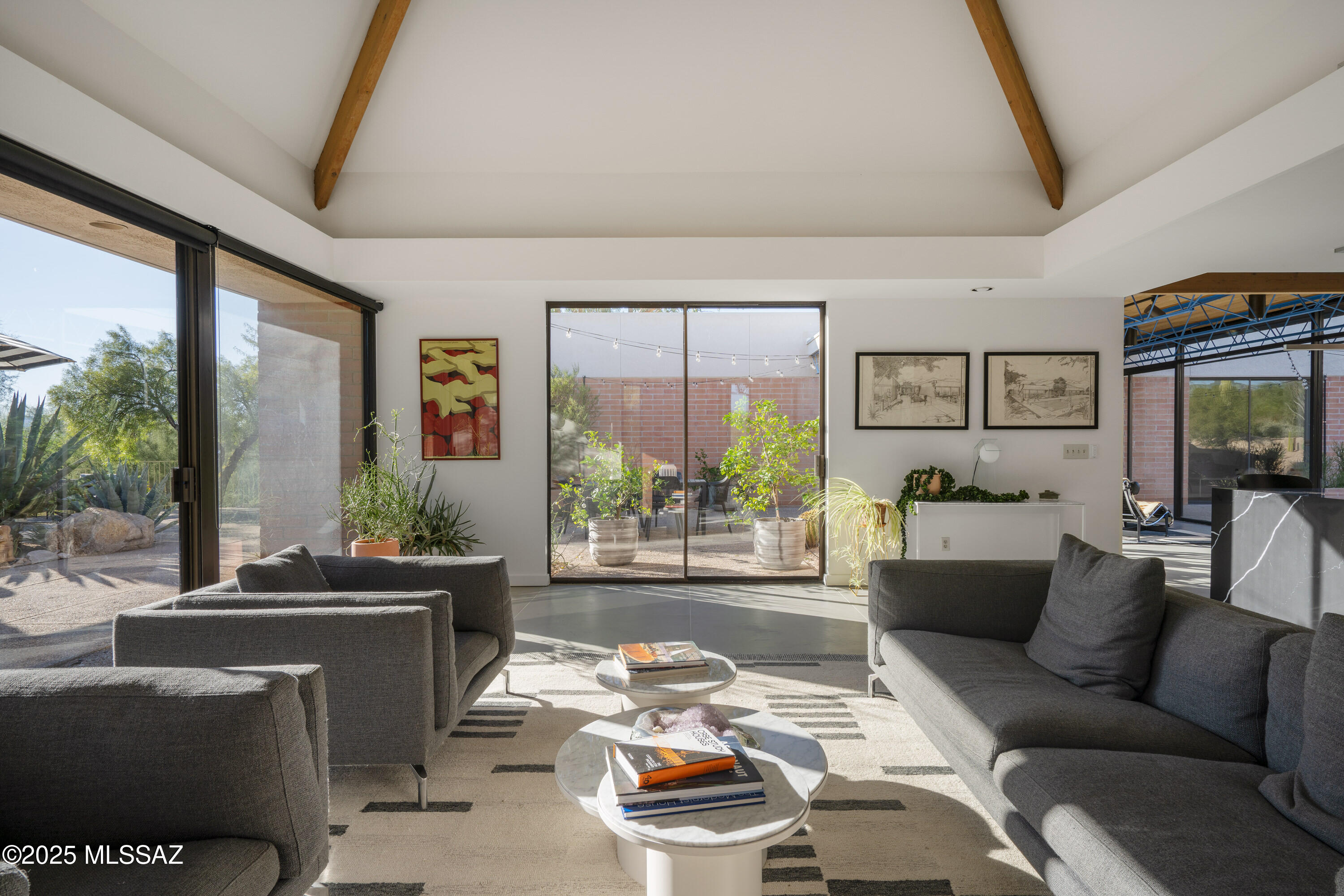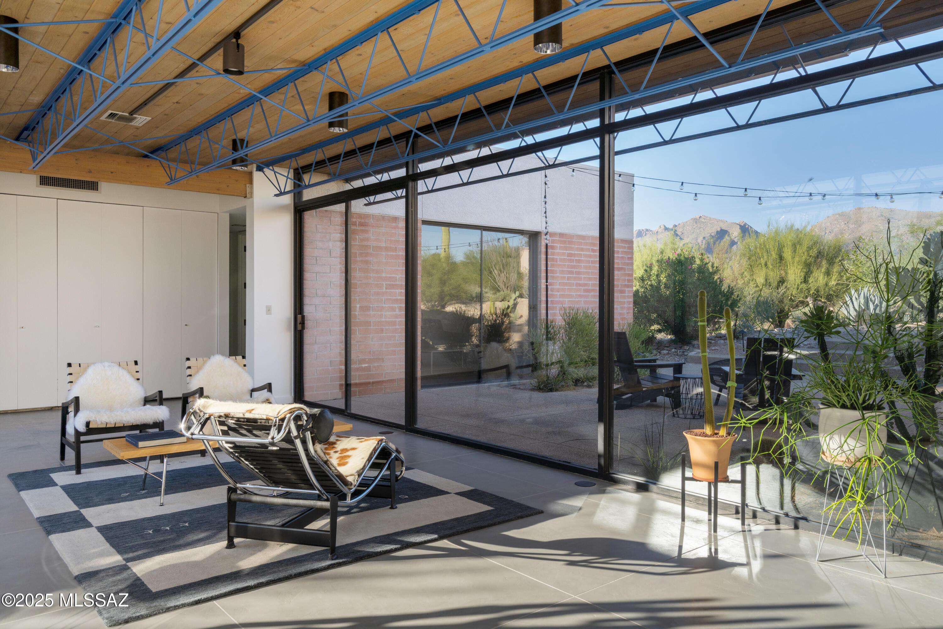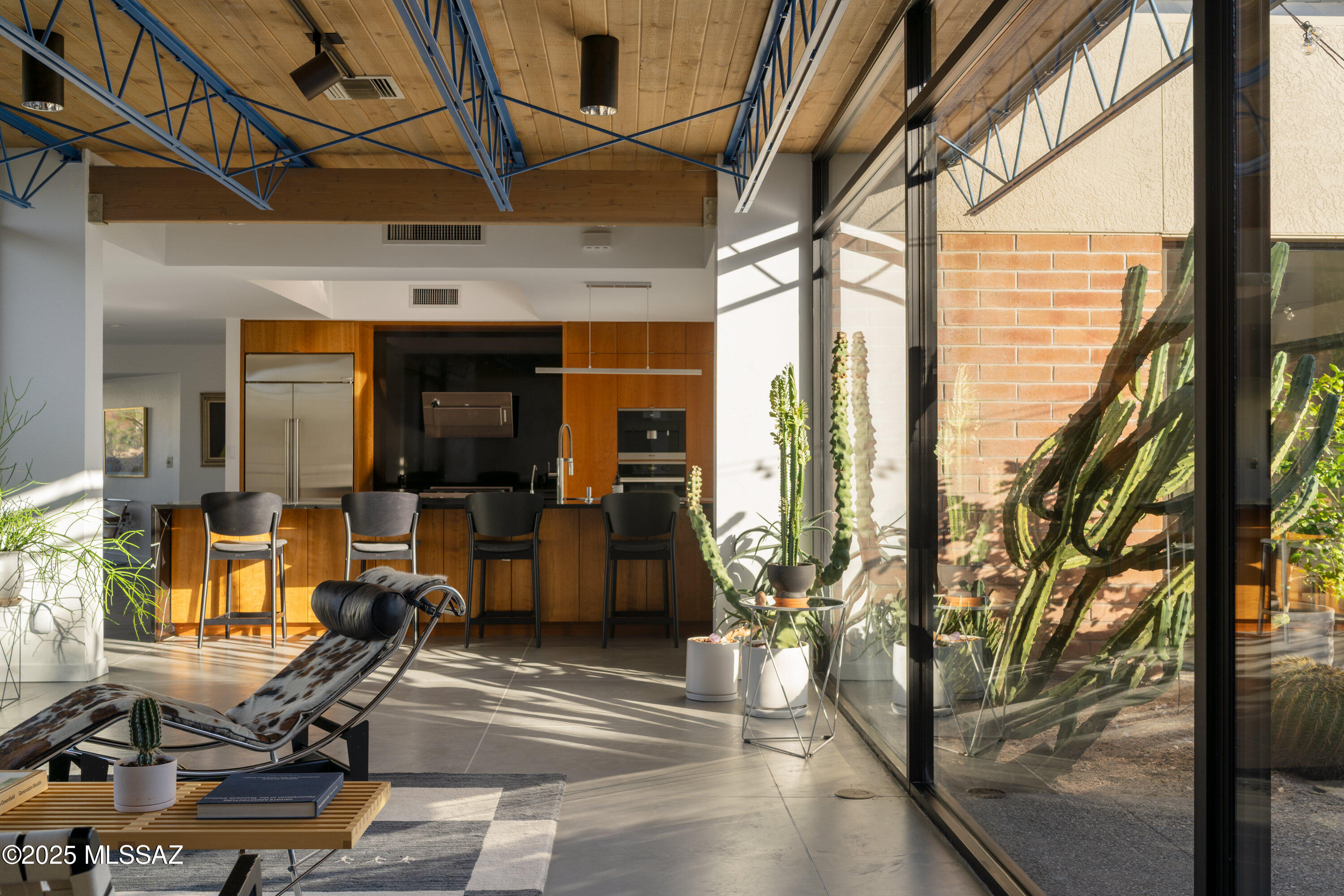 Tucked into the desert on a quiet side street off Campbell Avenue, the Module House by architect Robert Swaim sits on 2.2 acres in the Catalina Foothills. It is a rare Limited Edition Series residence, the only realized example of Swaim's modular concept, with sweeping mountain, city, & sunset views. The home was featured in Sunset magazine; the original owner served as Vice President & Editor at Sunset at the time. An honest material palette was carefully carried throughout: concrete, masonry, and glass, with a clear expression of structure. A central spine organizes volume and movement, while vaulted ceilings and expansive walls of glass connect the interior to patios, pool, and desert. The boundary between inside and out is continuous. Floors, framed views, & walls extend out into the landscape. The landscape reciprocates as shadows and reflections, the desert beyond is drawn into the rooms. The open plan of public spaces brings in natural light throughout the day and supports easy living between indoors and out.