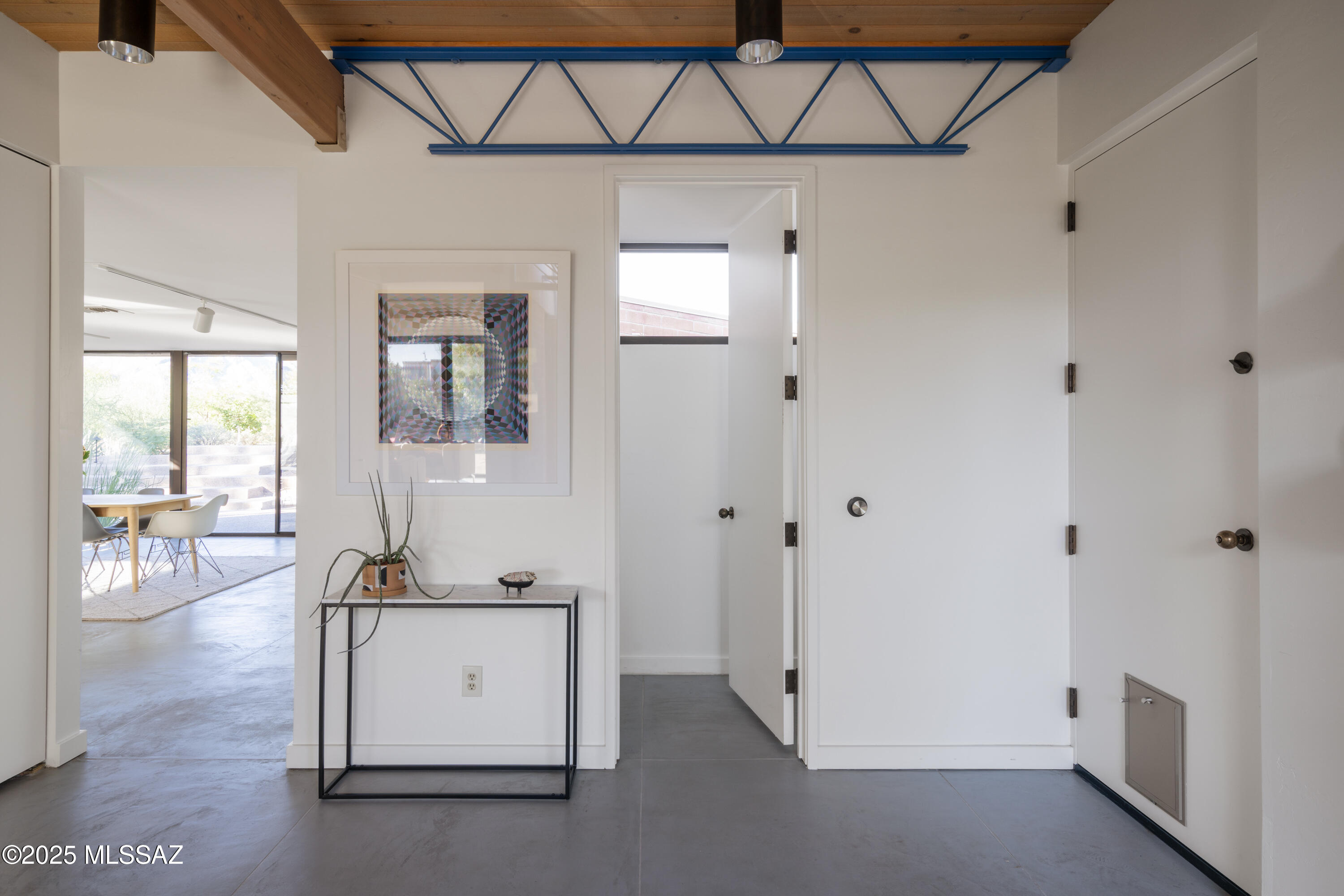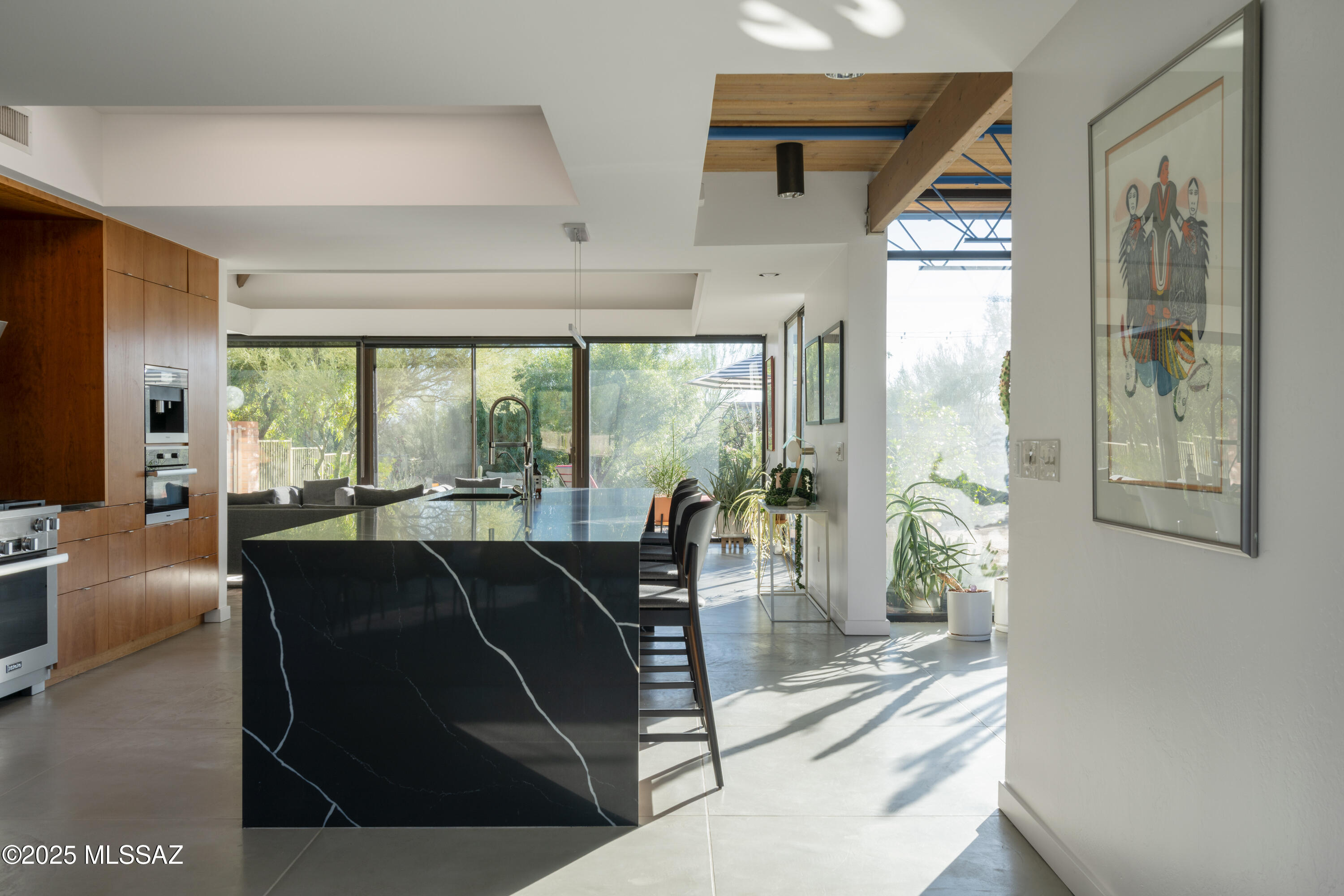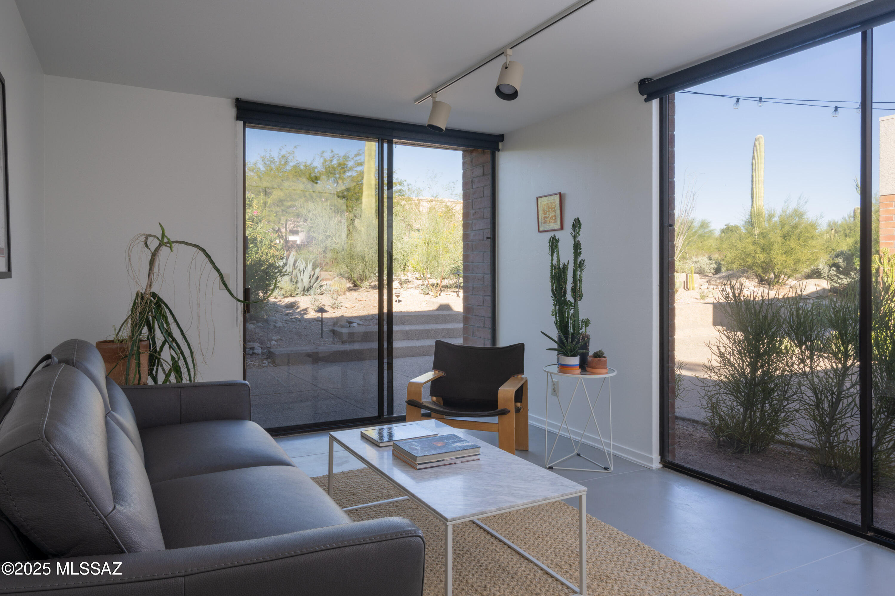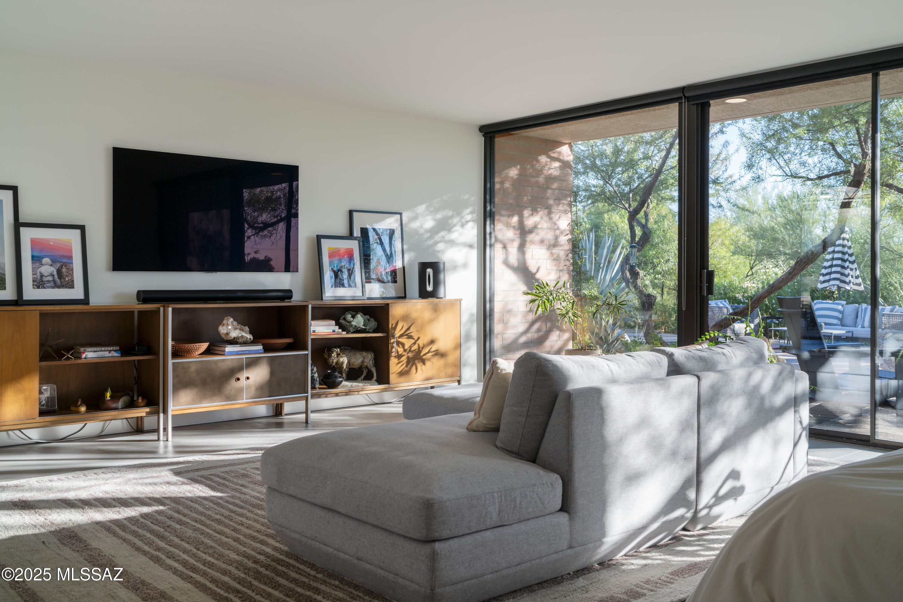 Tucked into the desert on a quiet side street off Campbell Avenue, the Module House by architect Robert Swaim sits on 2.2 acres in the Catalina Foothills. It is a rare Limited Edition Series residence, the only realized example of Swaim's modular concept, with sweeping mountain, city, & sunset views. The home was featured in Sunset magazine; the original owner served as Vice President & Editor at Sunset at the time. An honest material palette was carefully carried throughout: concrete, masonry, and glass, with a clear expression of structure. A central spine organizes volume and movement, while vaulted ceilings and expansive walls of glass connect the interior to patios, pool, and desert. The boundary between inside and out is continuous. Floors, framed views, & walls extend out into the landscape. The landscape reciprocates as shadows and reflections, the desert beyond is drawn into the rooms. The open plan of public spaces brings in natural light throughout the day and supports easy living between indoors and out.