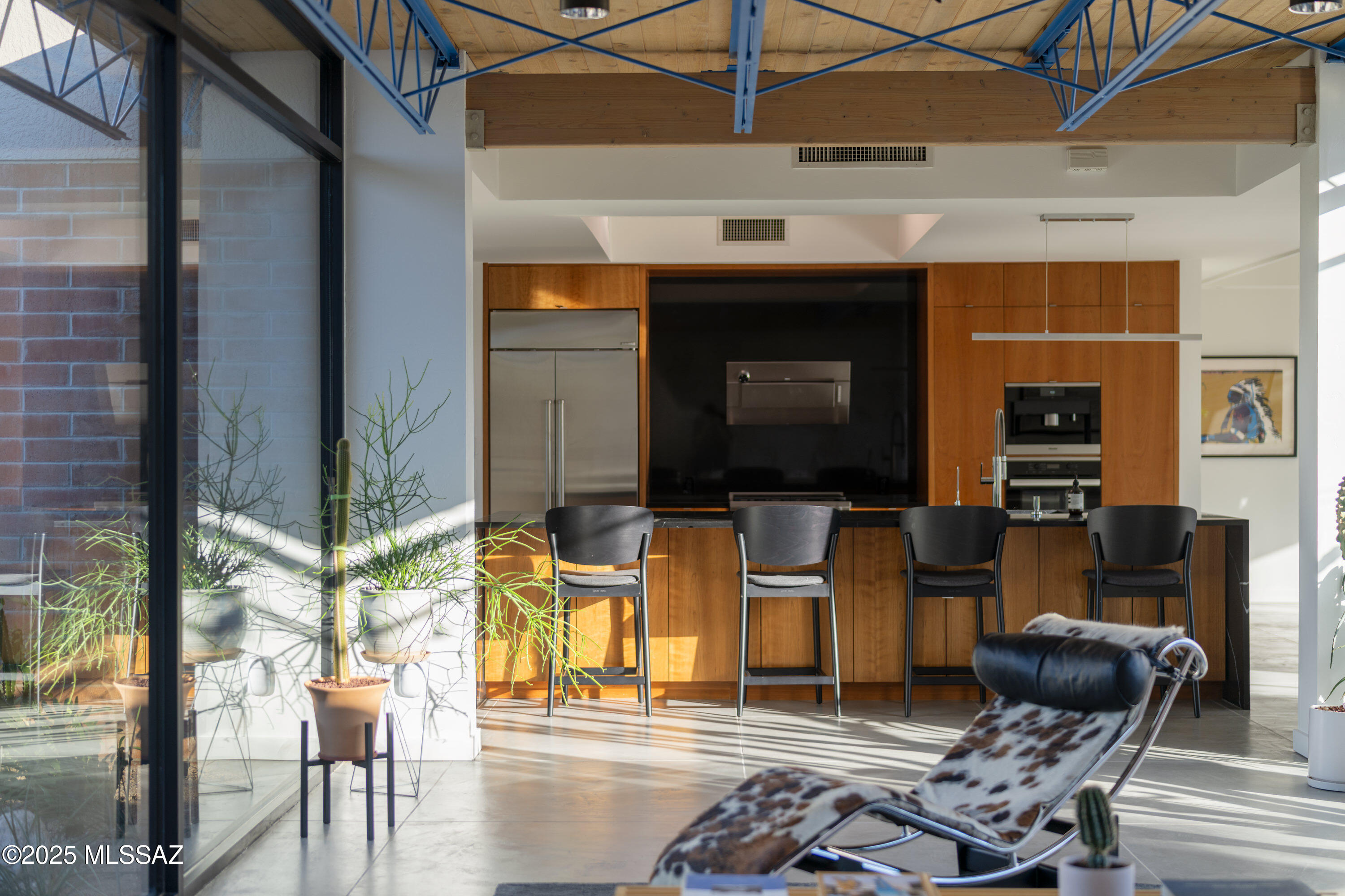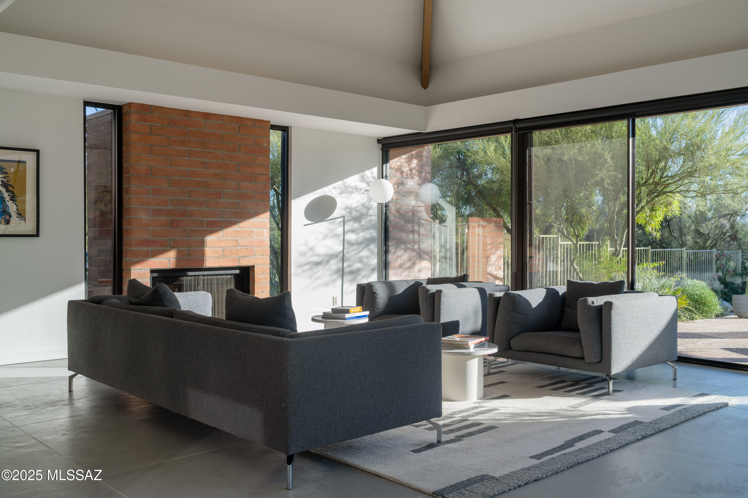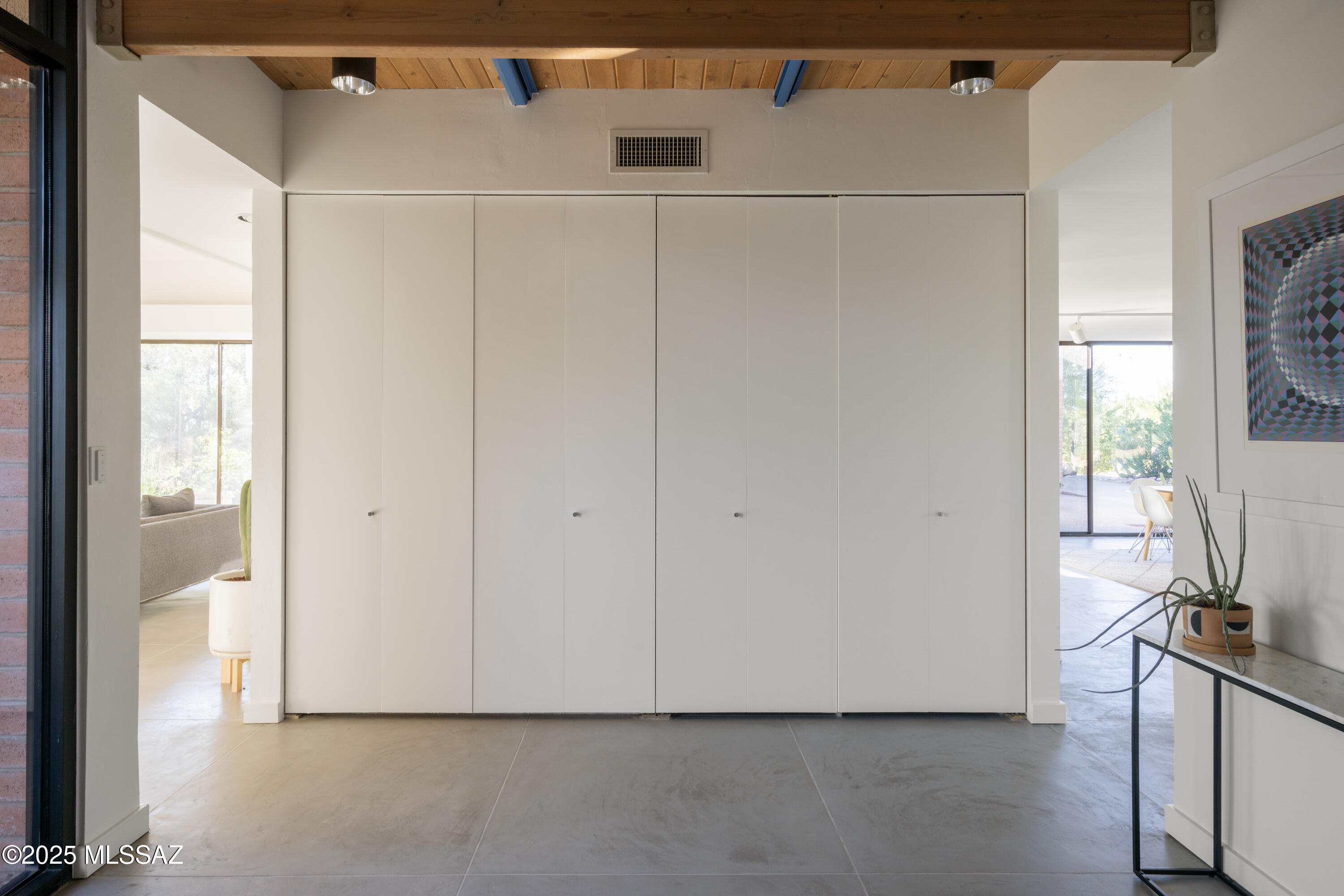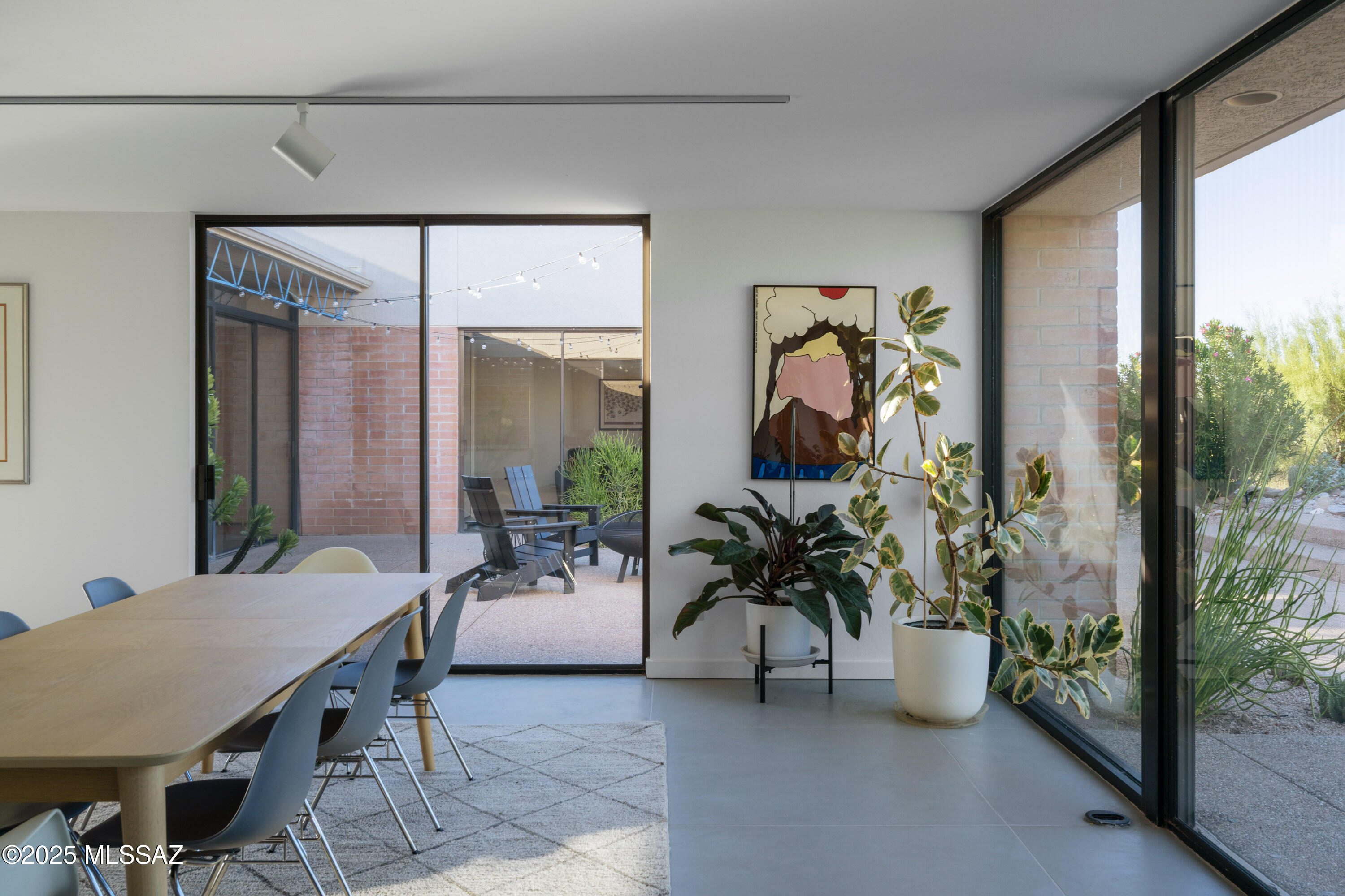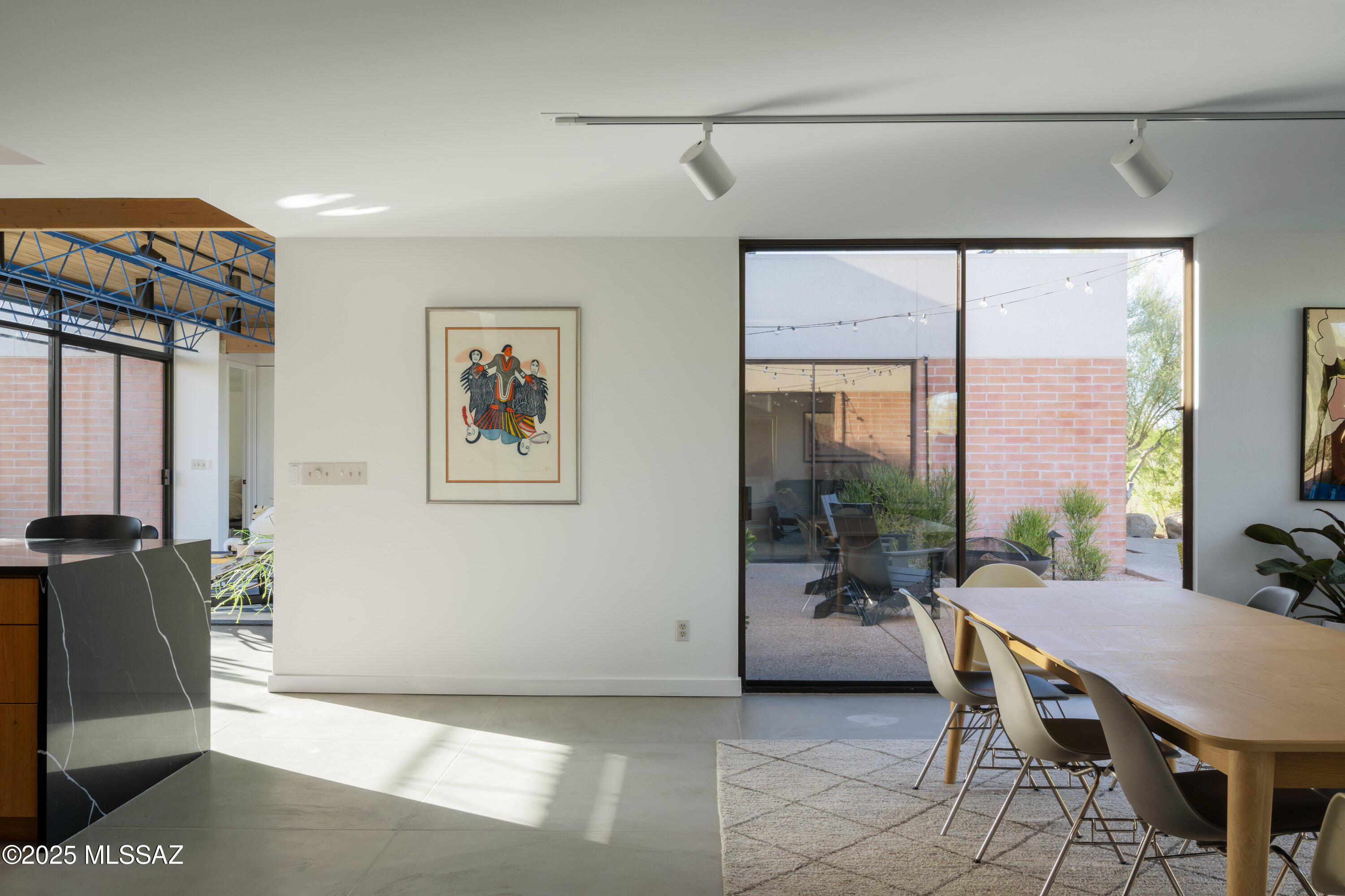Tucked into the desert on a quiet side street off Campbell Avenue, the Module House by architect Robert Swaim sits on 2.2 acres in the Catalina Foothills. It is a rare Limited Edition Series residence, the only realized example of Swaim's modular concept, with sweeping mountain, city, & sunset views. The home was featured in Sunset magazine; the original owner served as Vice President & Editor at Sunset at the time. An honest material palette was carefully carried throughout: concrete, masonry, and glass, with a clear expression of structure. A central spine organizes volume and movement, while vaulted ceilings and expansive walls of glass connect the interior to patios, pool, and desert. The boundary between inside and out is continuous. Floors, framed views, & walls extend out into the landscape. The landscape reciprocates as shadows and reflections, the desert beyond is drawn into the rooms. The open plan of public spaces brings in natural light throughout the day and supports easy living between indoors and out.