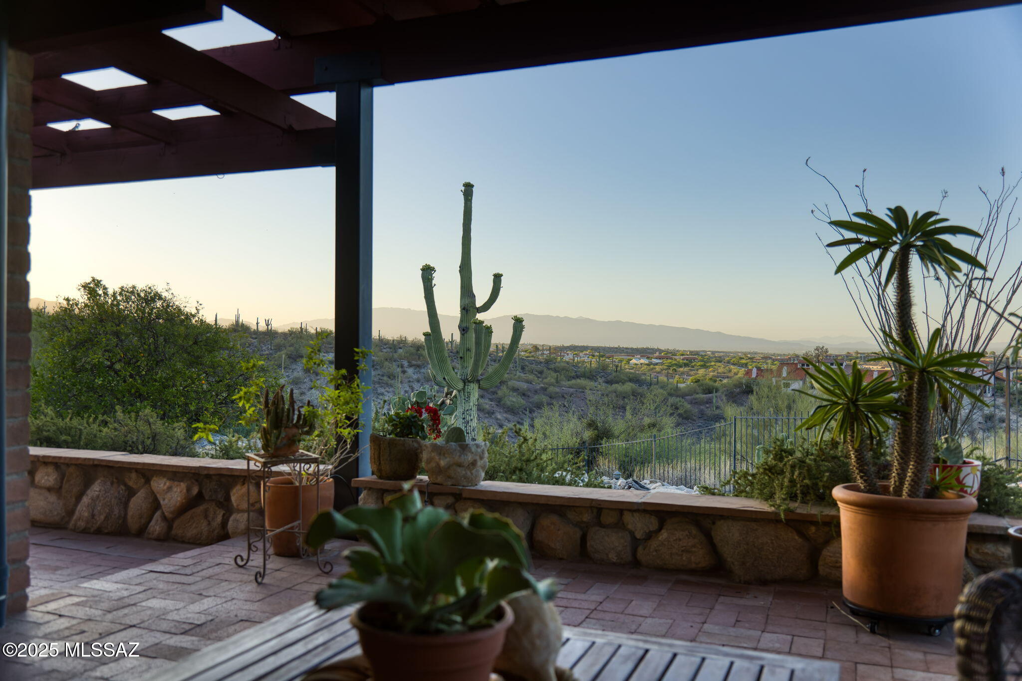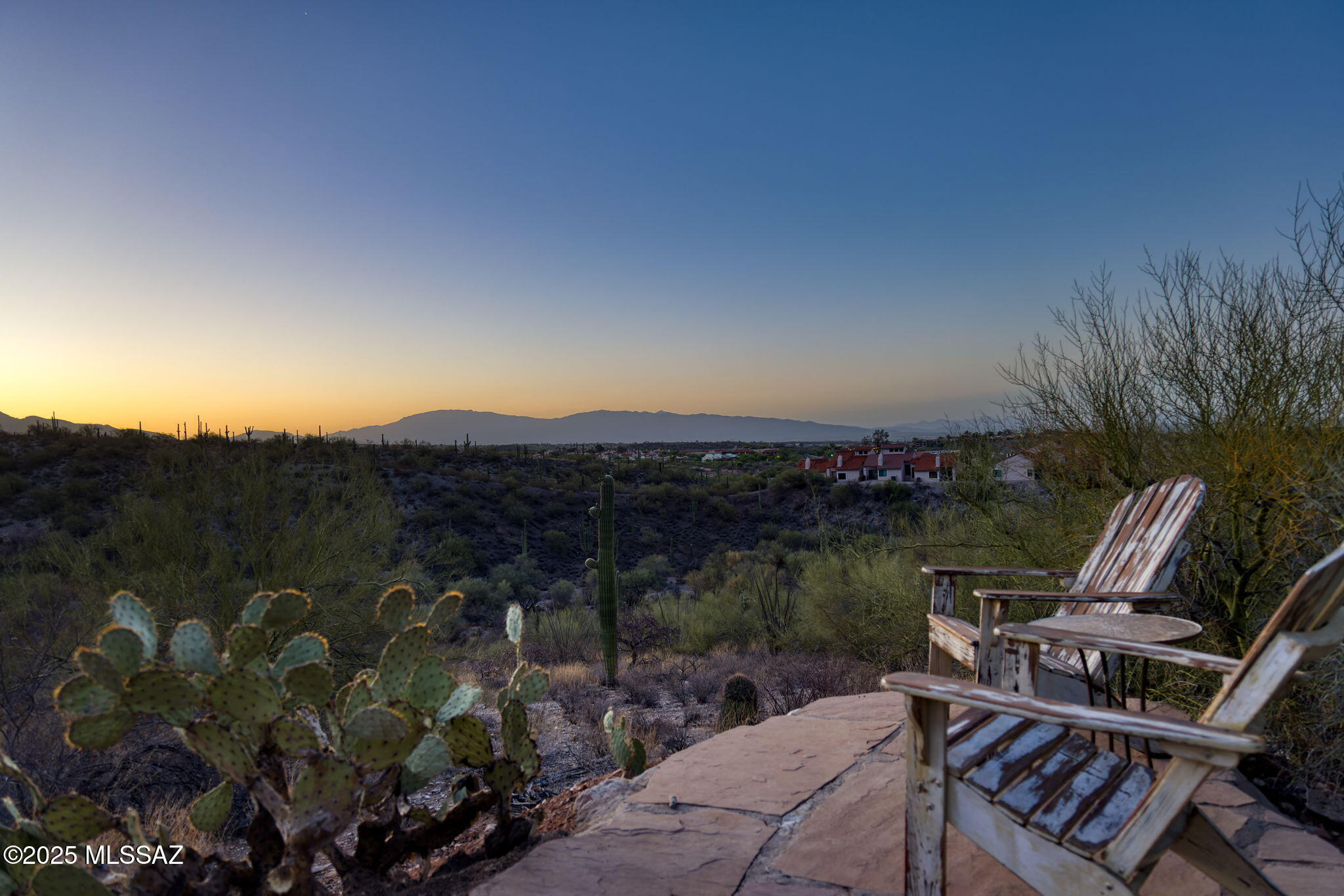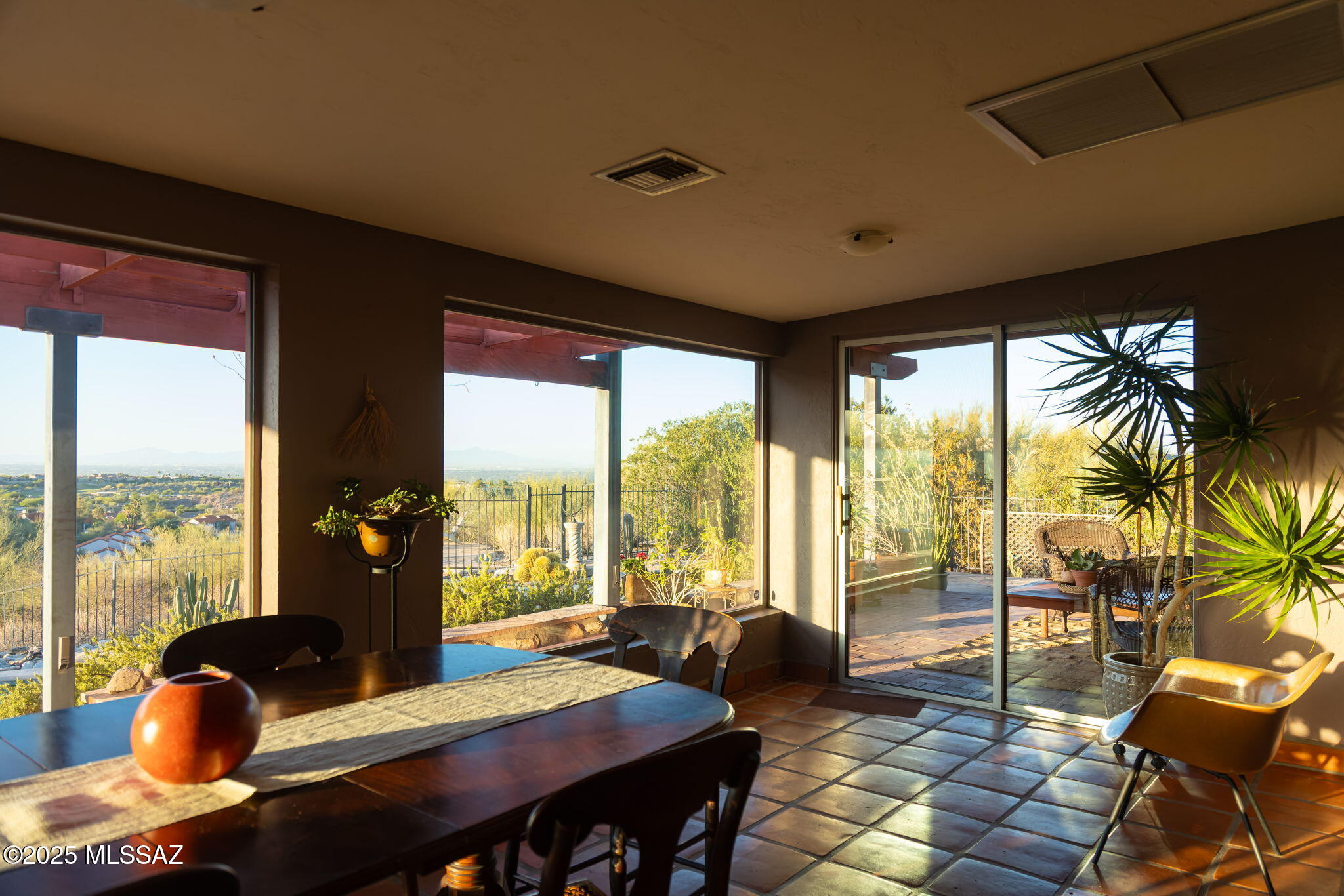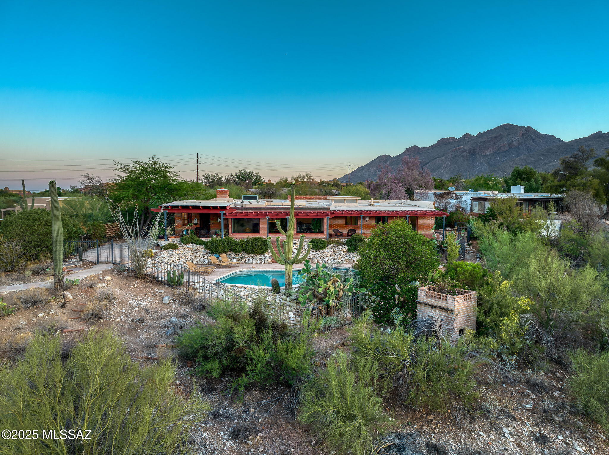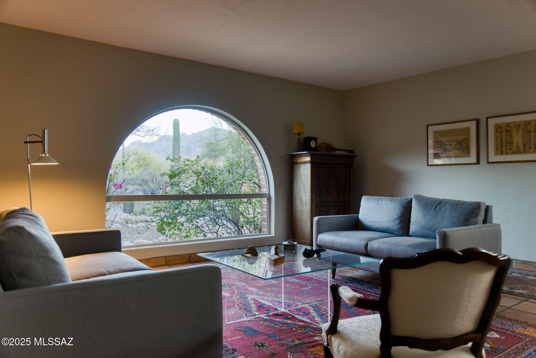 Set high on an elevated lot within the Catalina Foothills, this 1974 burnt adobe home offers sweeping 180 degree views that extend from the rugged peaks of the Catalinas to the glow of the city lights below. Tucked at the end of a quiet cul-de-sac, this property feels both grounded and expansive - its architecture rooted in the desert, its spirit shaped by decades of memory, ritual, and the cadence of Sonoran life. Once inside, generous natural light and thoughtfully framed views define the living spaces - whether it's the mountains illuminated by afternoon sun from the formal living room, or the mesquite filtered light that drifts into the office each day. The open kitchen connects seamlessly to the family room and sunroom, inviting conversation across spaces.