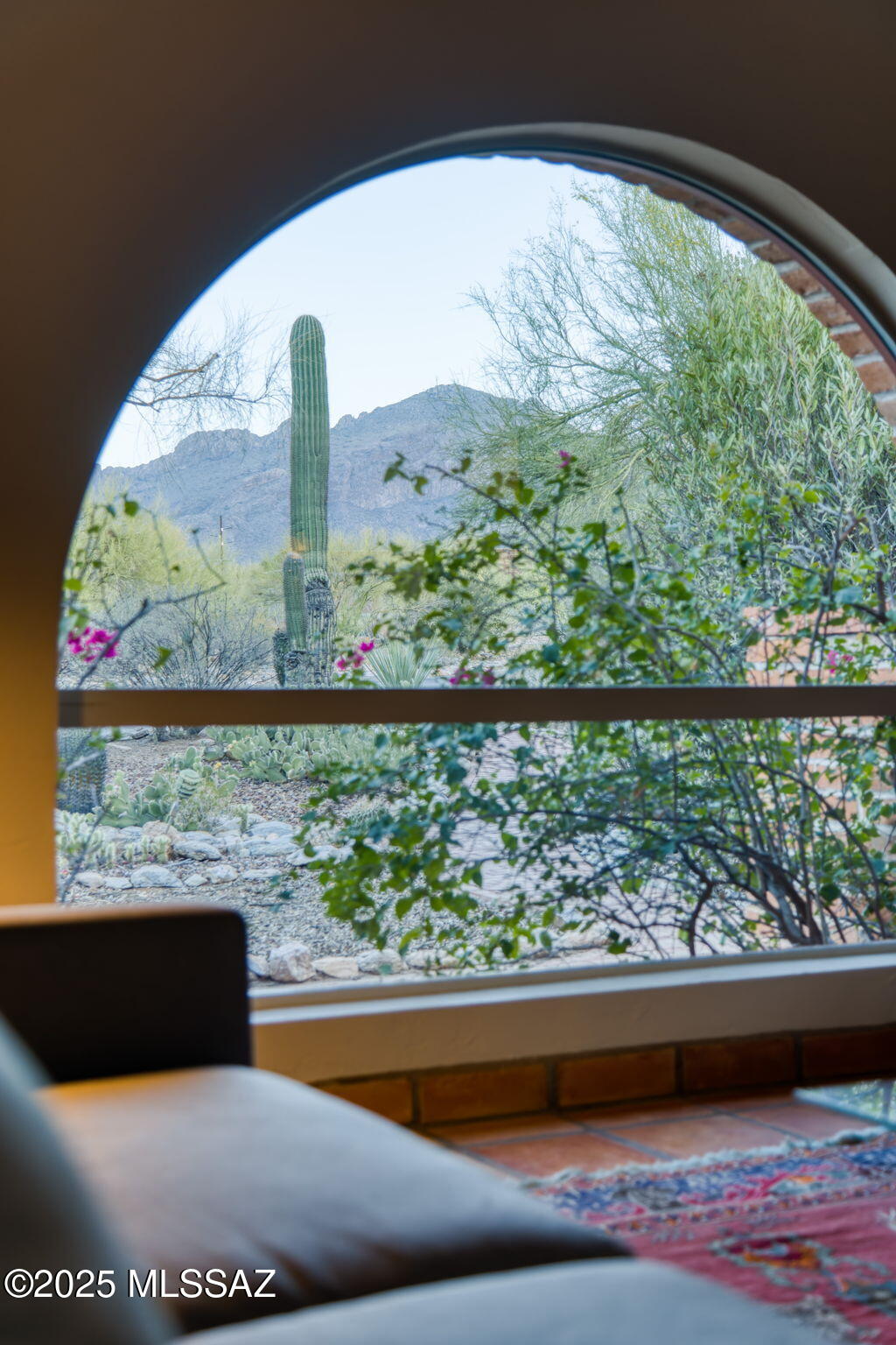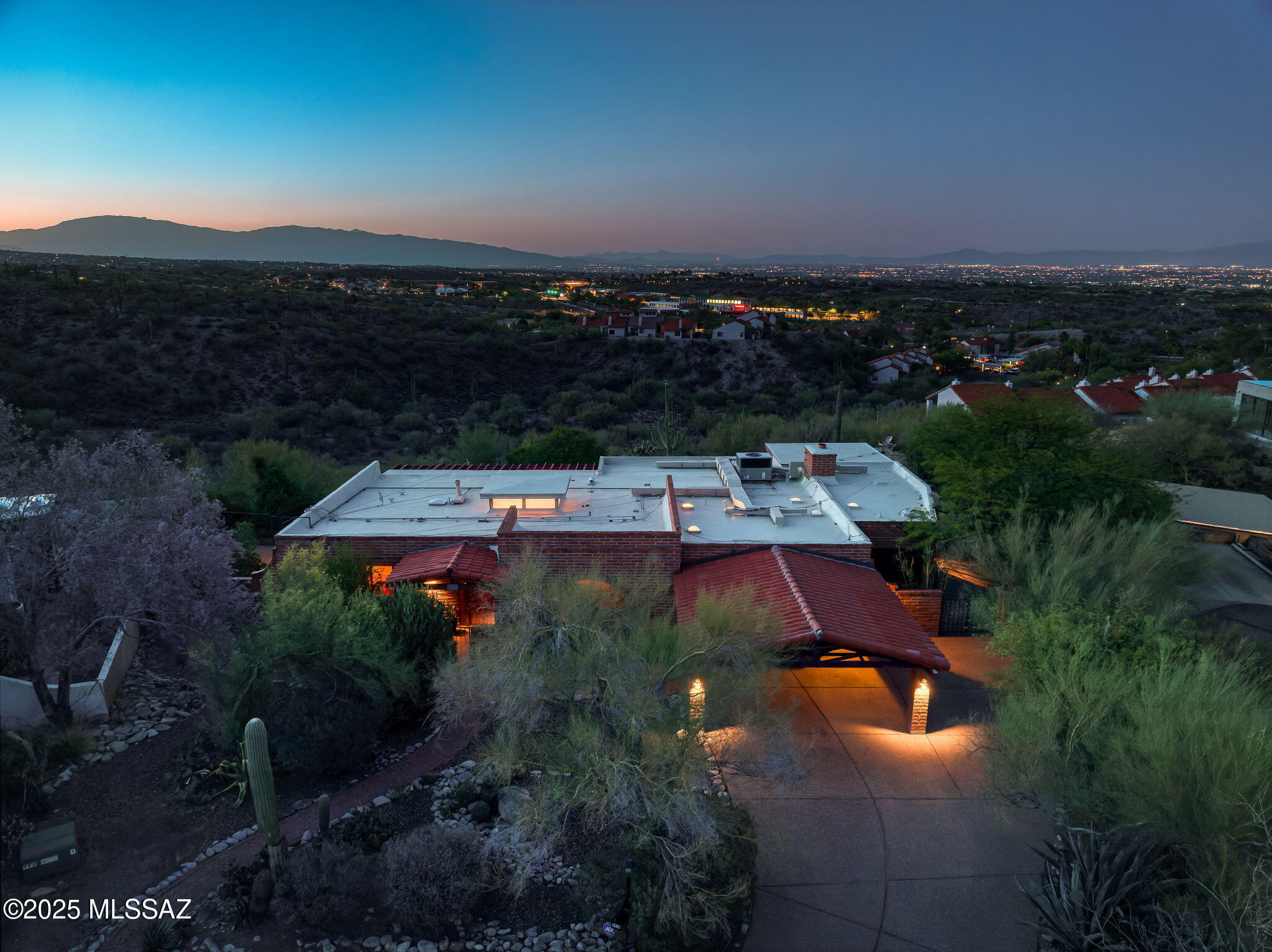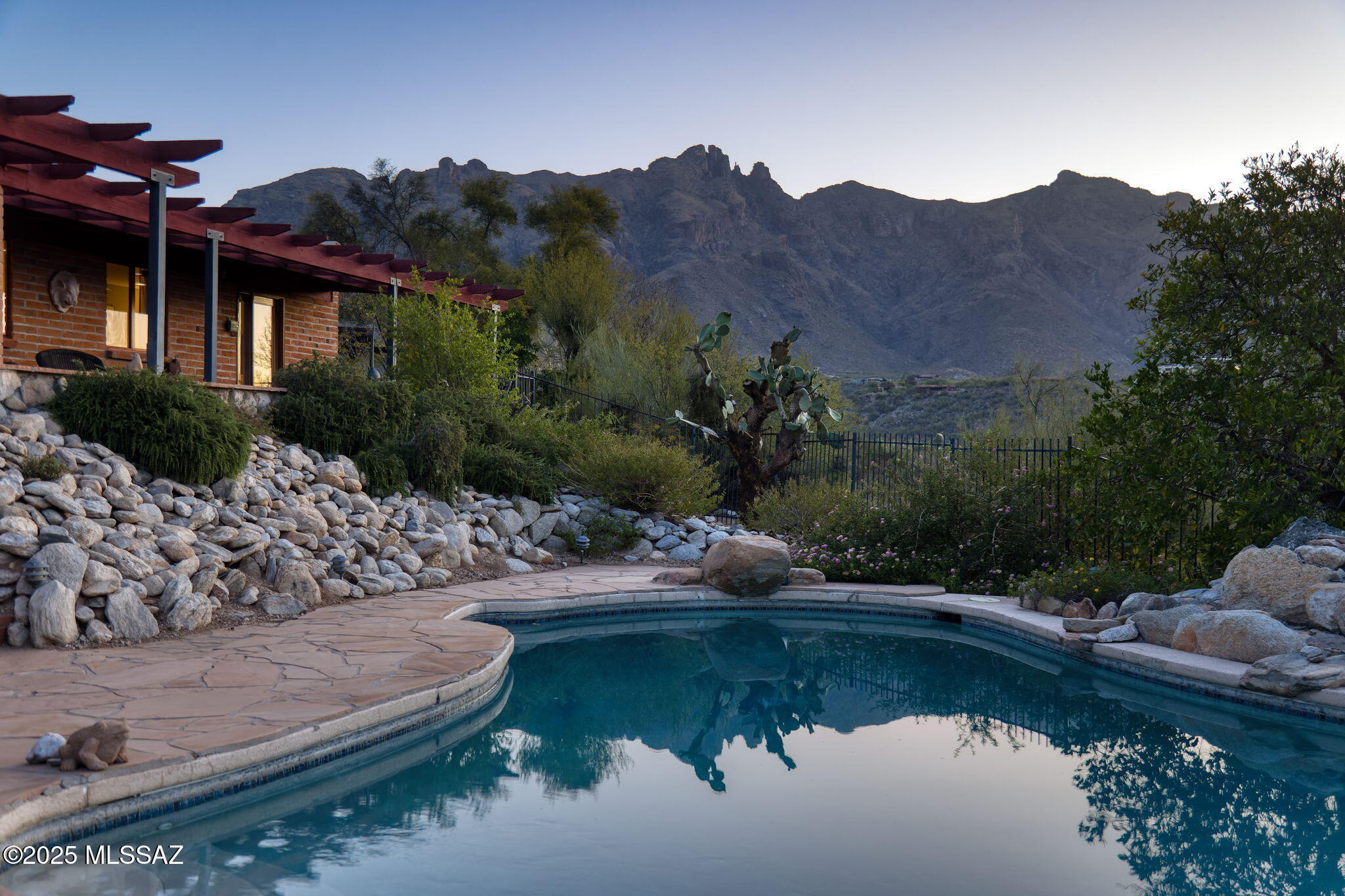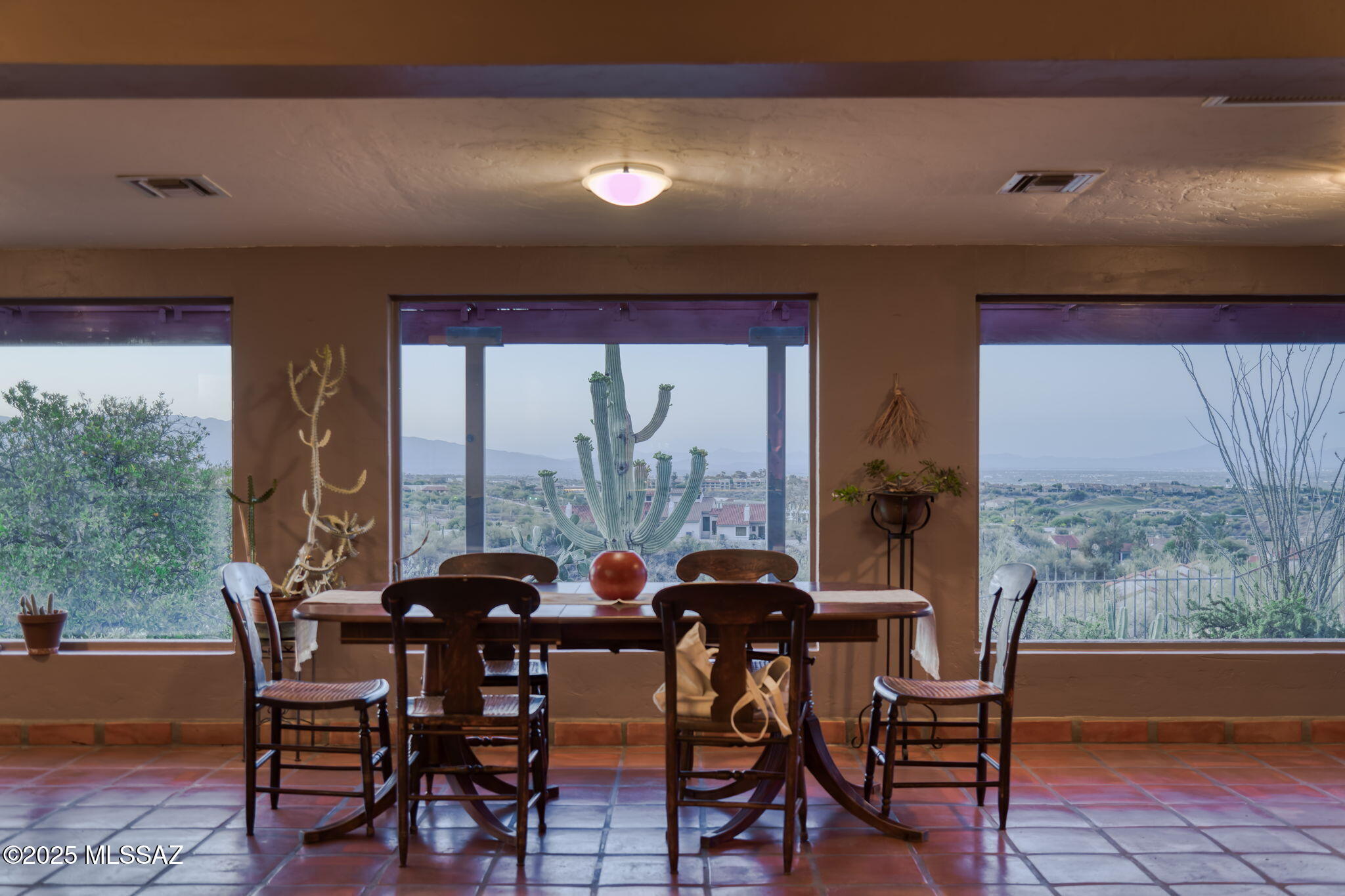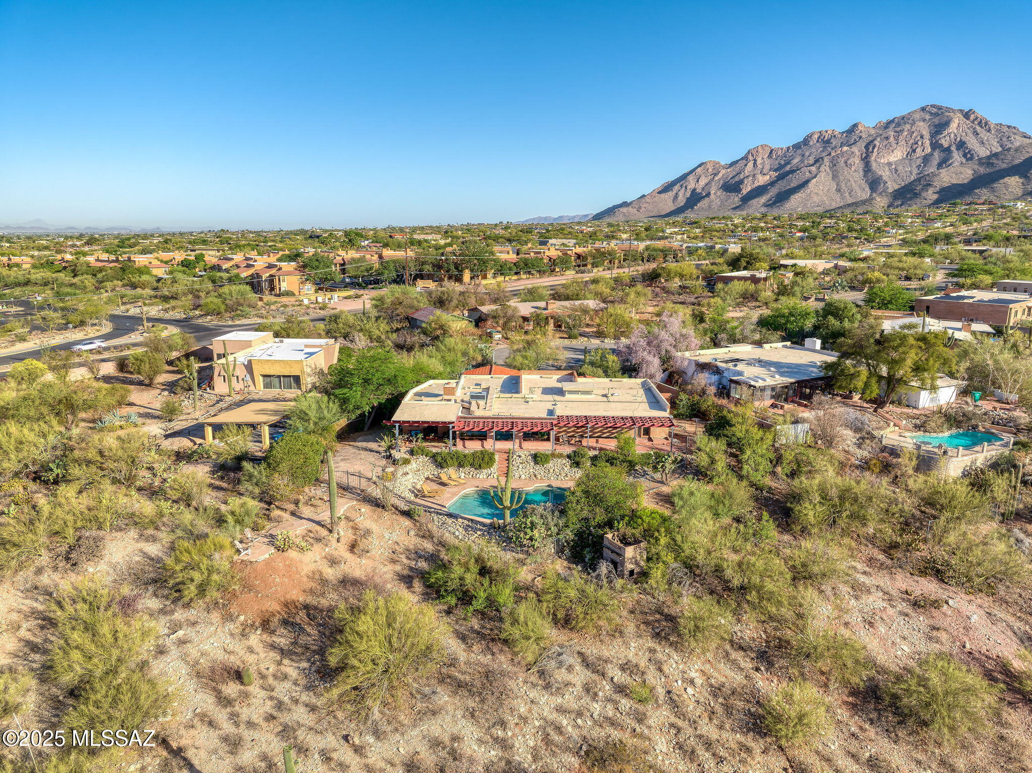 Set high on an elevated lot within the Catalina Foothills, this 1974 burnt adobe home offers sweeping 180 degree views that extend from the rugged peaks of the Catalinas to the glow of the city lights below. Tucked at the end of a quiet cul-de-sac, this property feels both grounded and expansive - its architecture rooted in the desert, its spirit shaped by decades of memory, ritual, and the cadence of Sonoran life. Once inside, generous natural light and thoughtfully framed views define the living spaces - whether it's the mountains illuminated by afternoon sun from the formal living room, or the mesquite filtered light that drifts into the office each day. The open kitchen connects seamlessly to the family room and sunroom, inviting conversation across spaces.