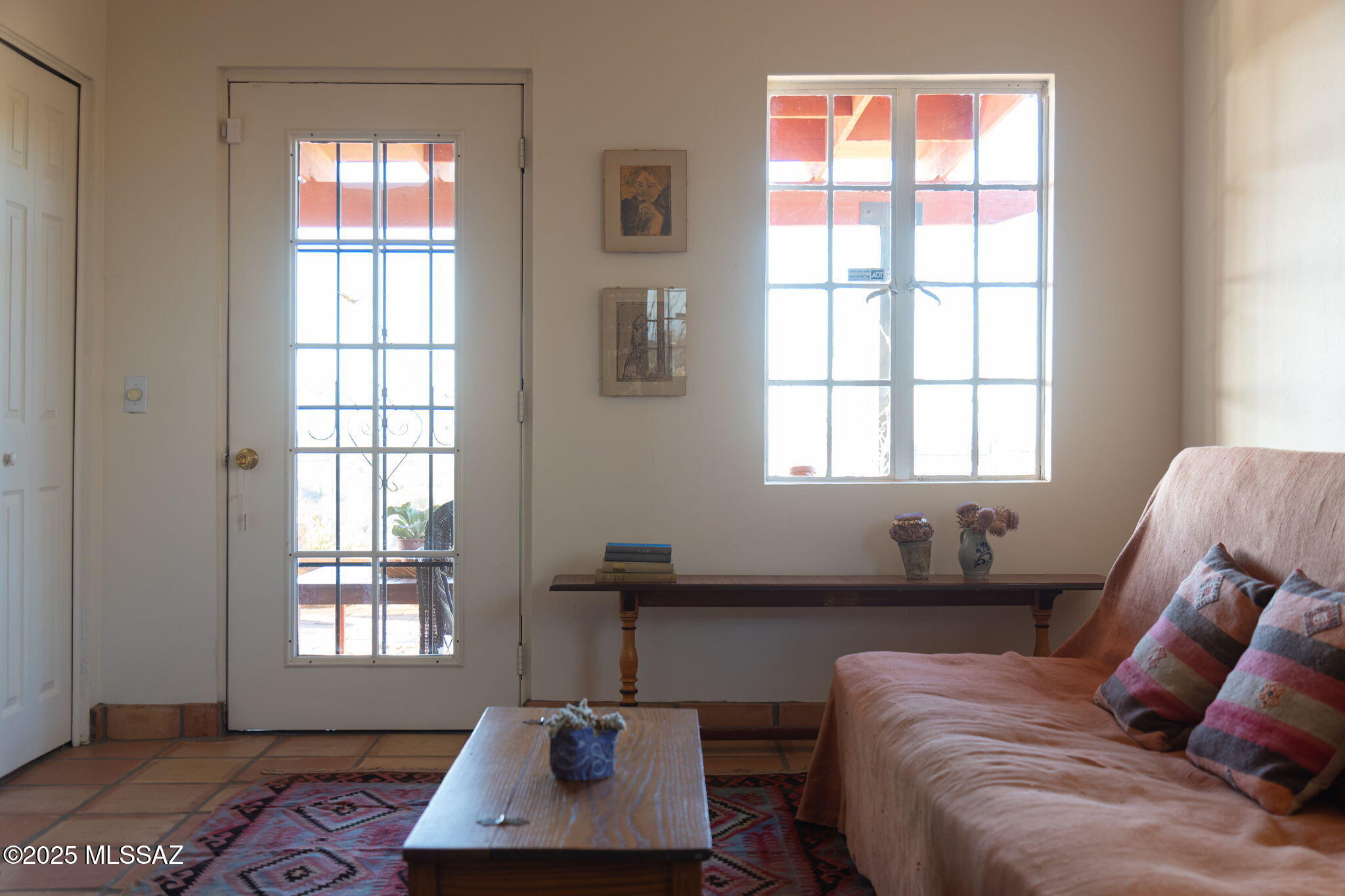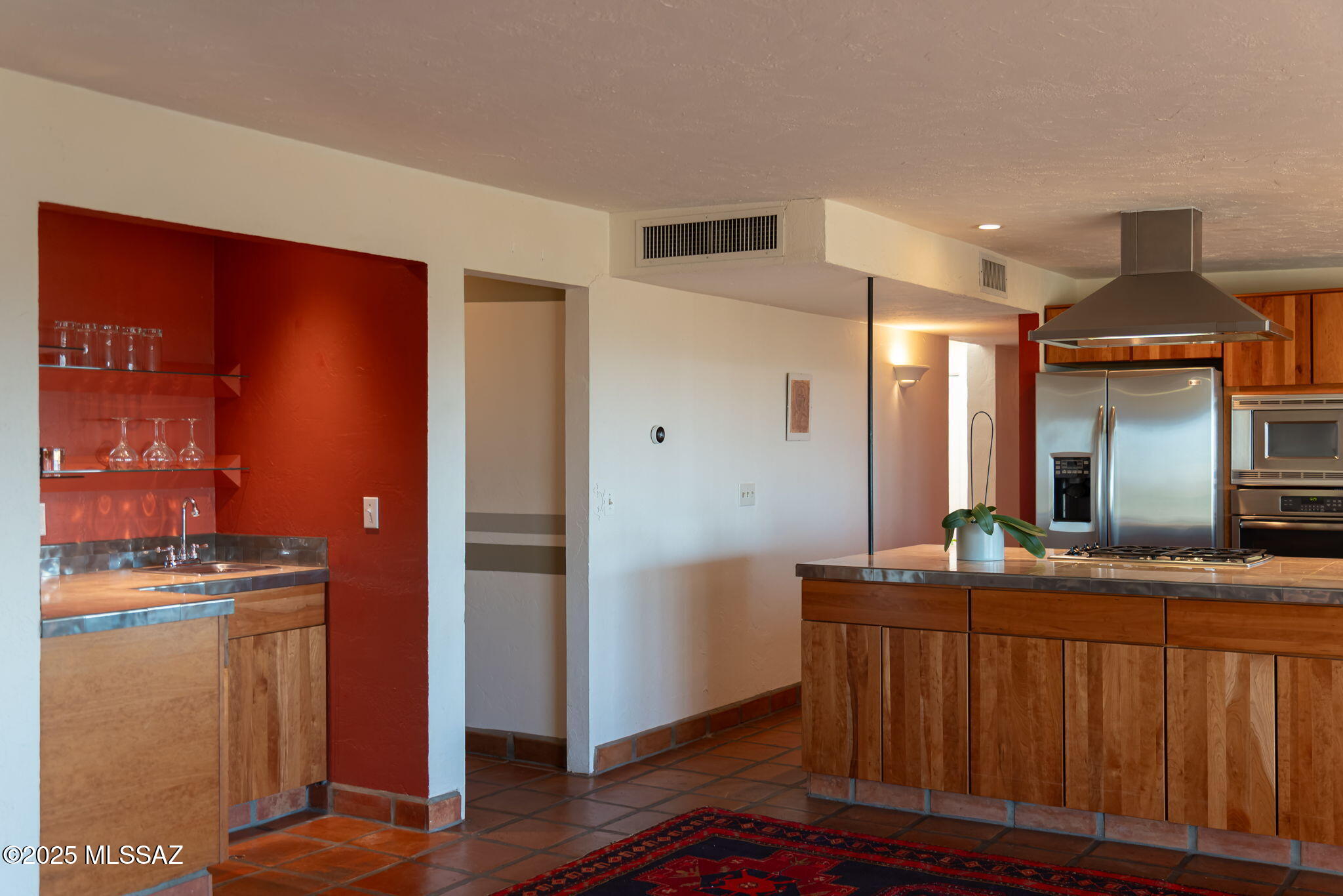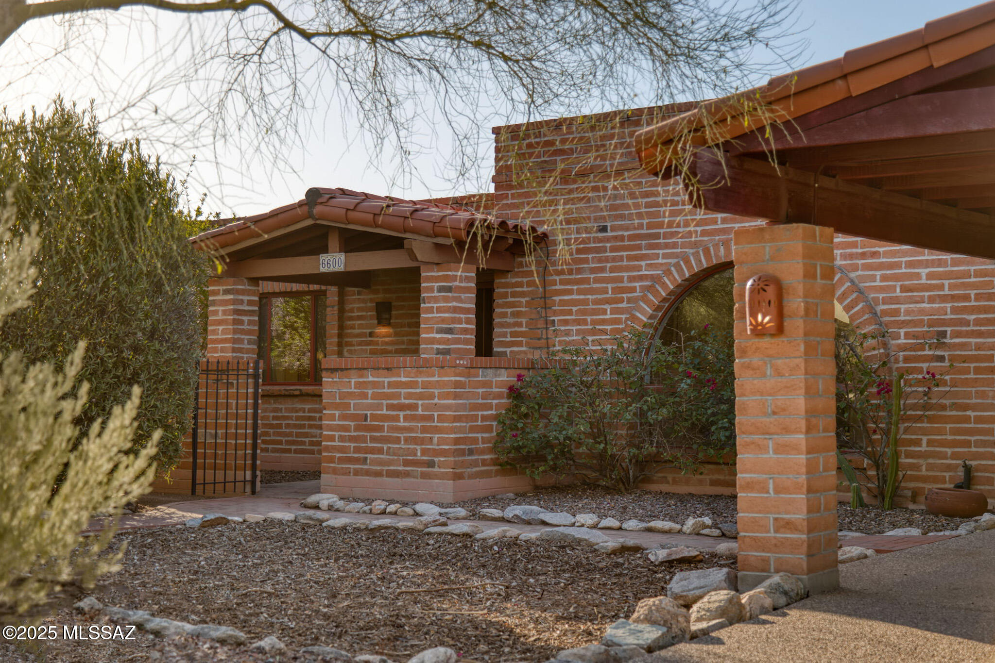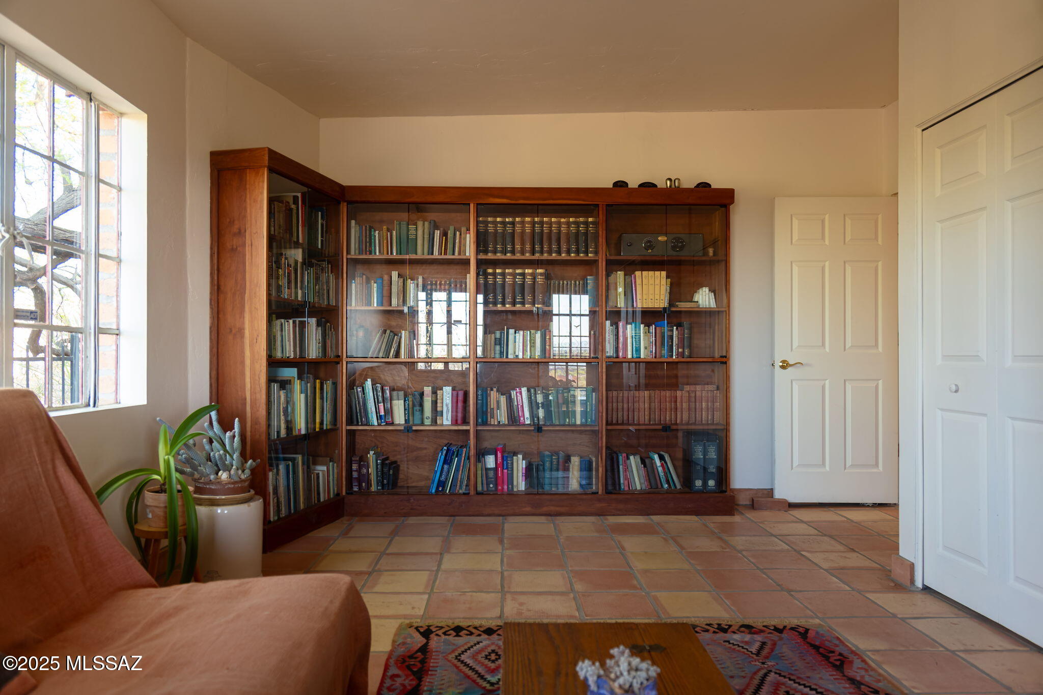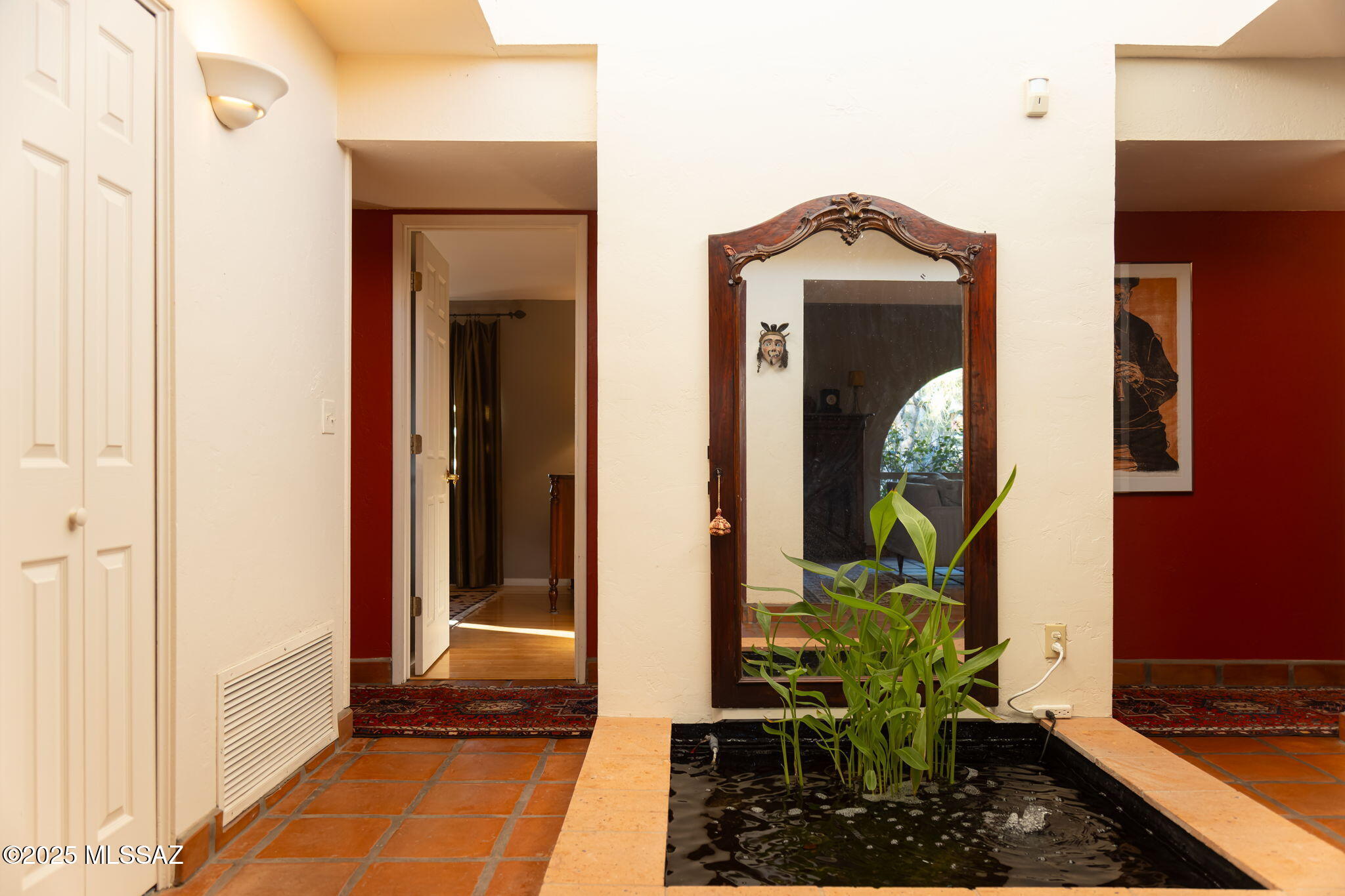 Set high on an elevated lot within the Catalina Foothills, this 1974 burnt adobe home offers sweeping 180 degree views that extend from the rugged peaks of the Catalinas to the glow of the city lights below. Tucked at the end of a quiet cul-de-sac, this property feels both grounded and expansive - its architecture rooted in the desert, its spirit shaped by decades of memory, ritual, and the cadence of Sonoran life. Once inside, generous natural light and thoughtfully framed views define the living spaces - whether it's the mountains illuminated by afternoon sun from the formal living room, or the mesquite filtered light that drifts into the office each day. The open kitchen connects seamlessly to the family room and sunroom, inviting conversation across spaces.