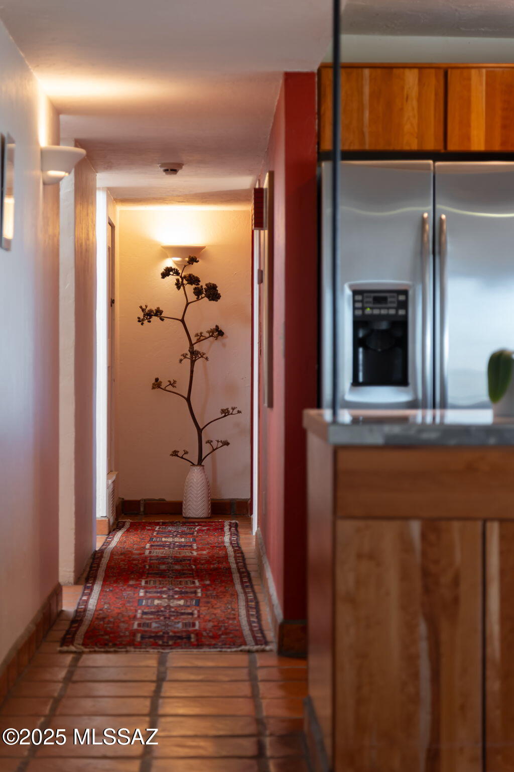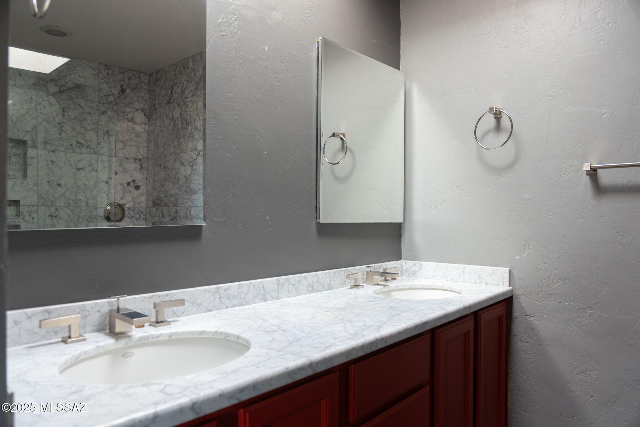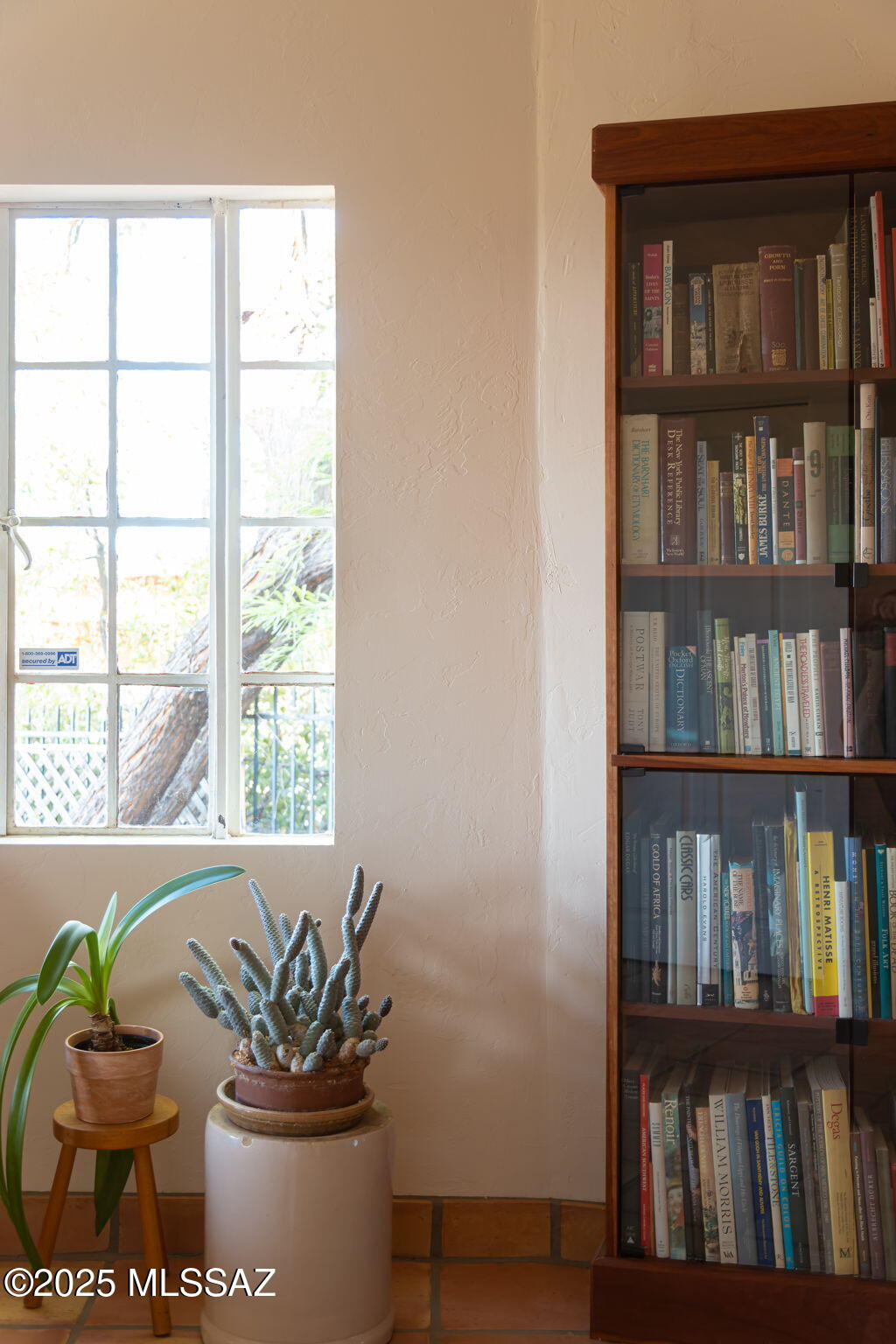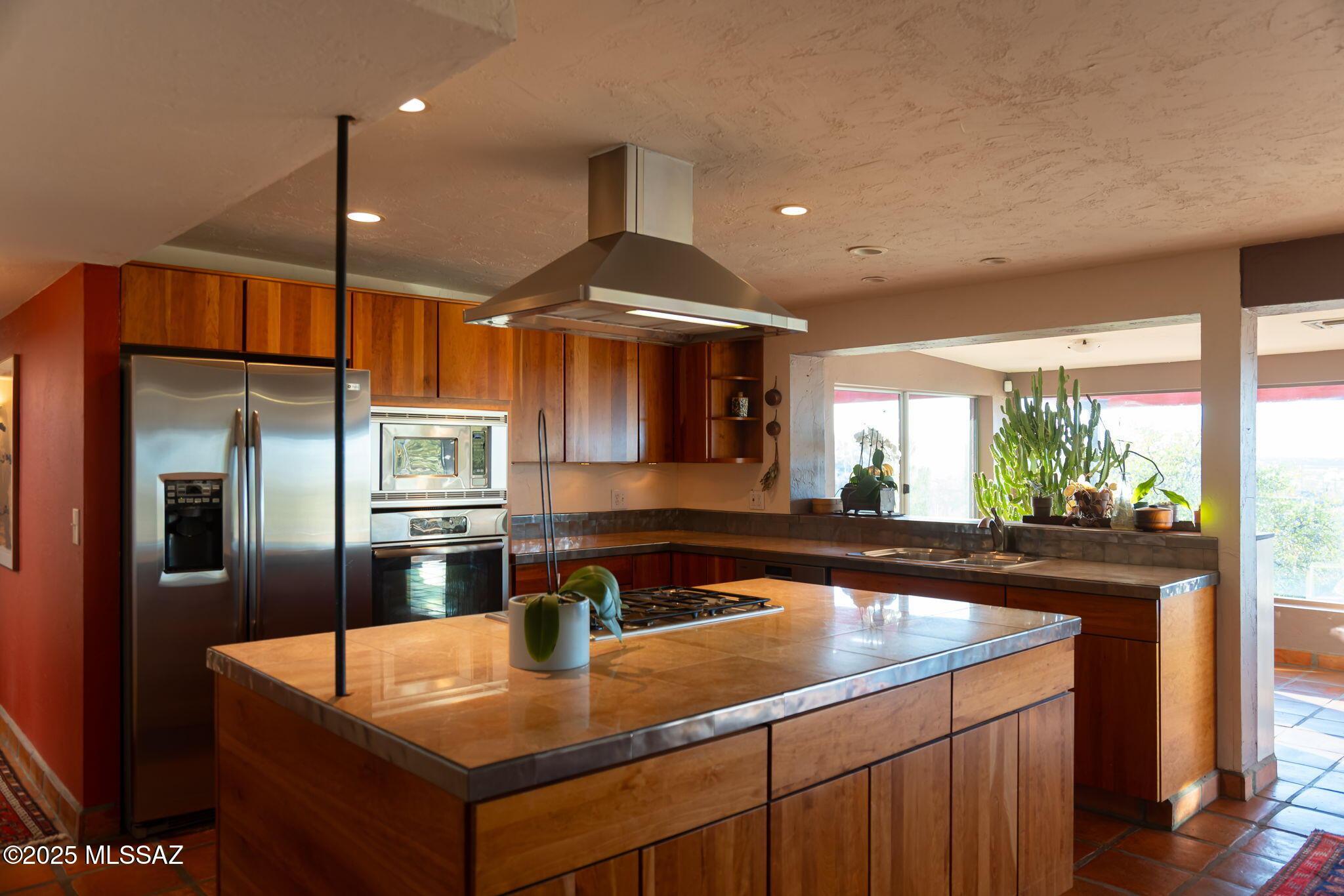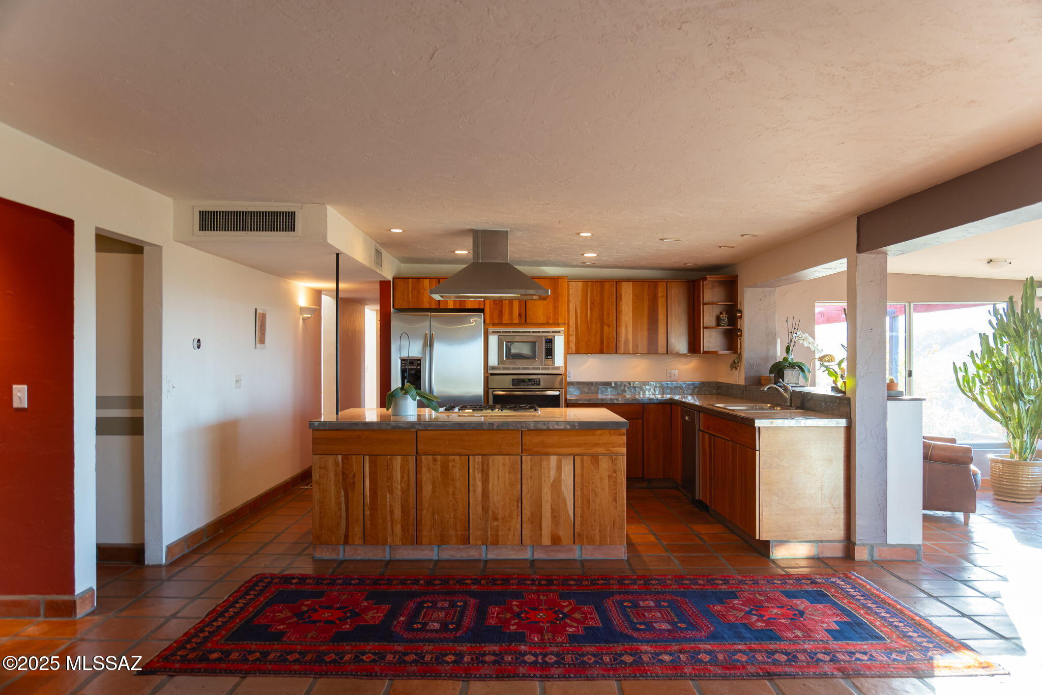 Set high on an elevated lot within the Catalina Foothills, this 1974 burnt adobe home offers sweeping 180 degree views that extend from the rugged peaks of the Catalinas to the glow of the city lights below. Tucked at the end of a quiet cul-de-sac, this property feels both grounded and expansive - its architecture rooted in the desert, its spirit shaped by decades of memory, ritual, and the cadence of Sonoran life. Once inside, generous natural light and thoughtfully framed views define the living spaces - whether it's the mountains illuminated by afternoon sun from the formal living room, or the mesquite filtered light that drifts into the office each day. The open kitchen connects seamlessly to the family room and sunroom, inviting conversation across spaces.