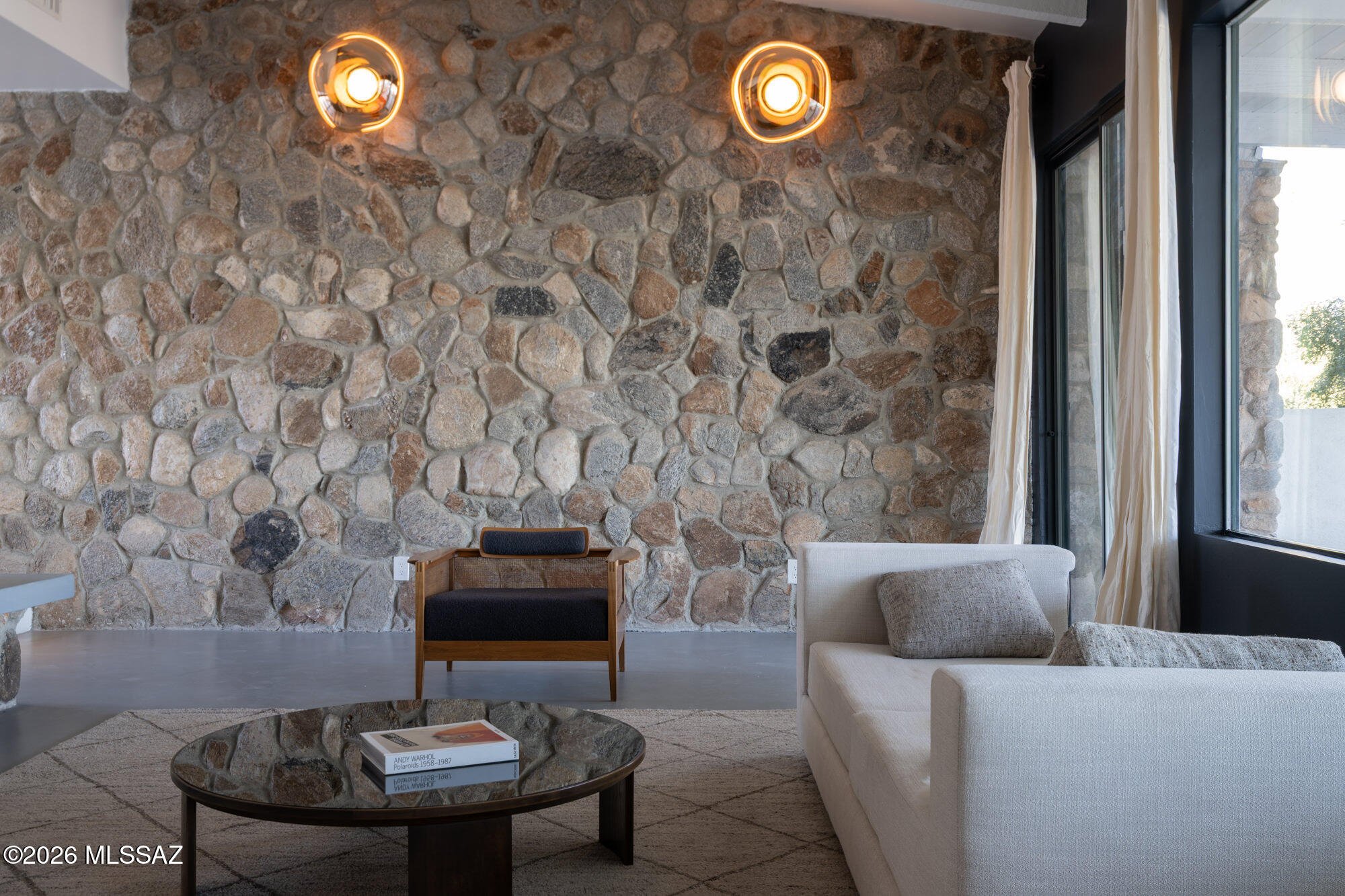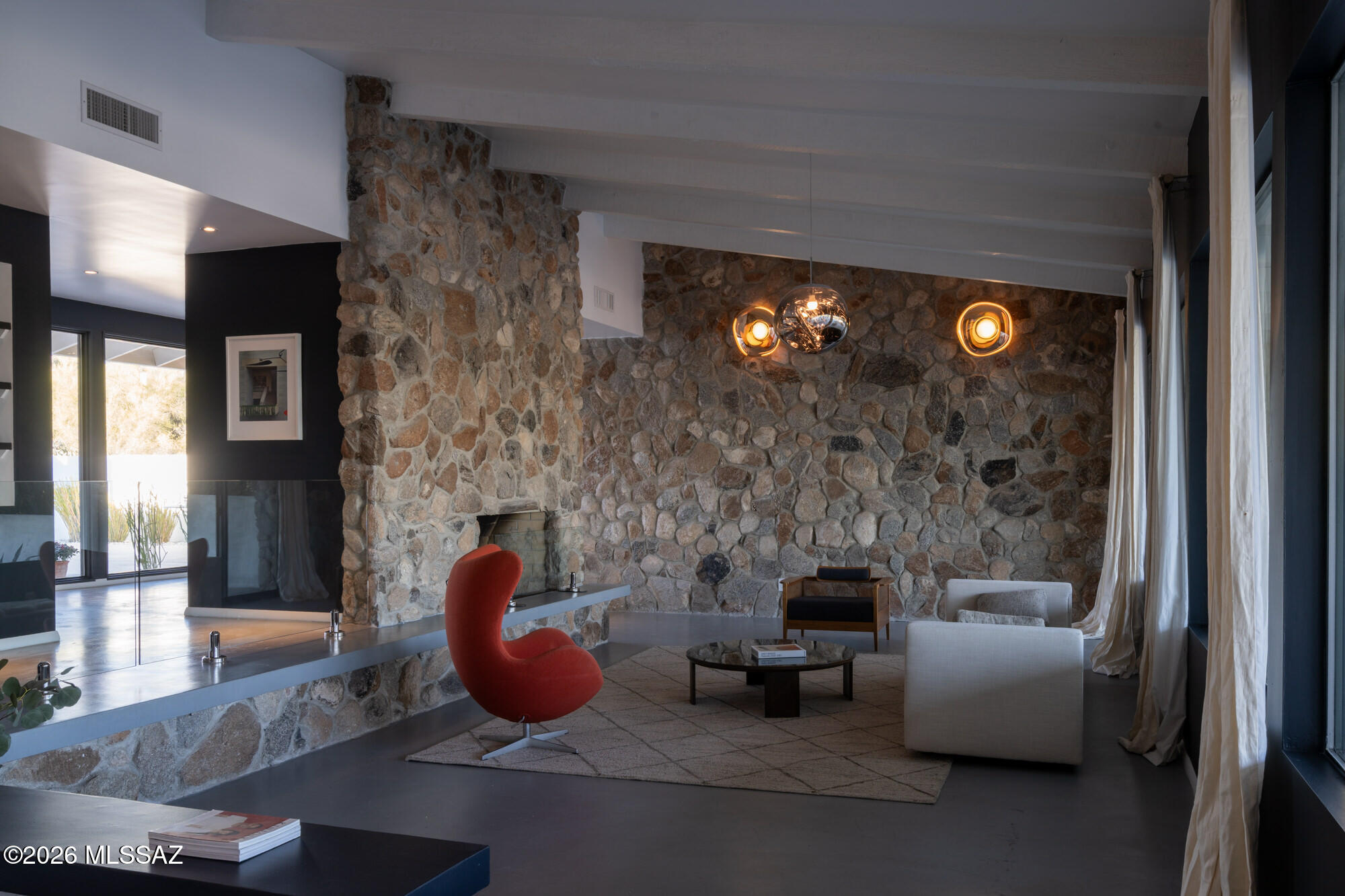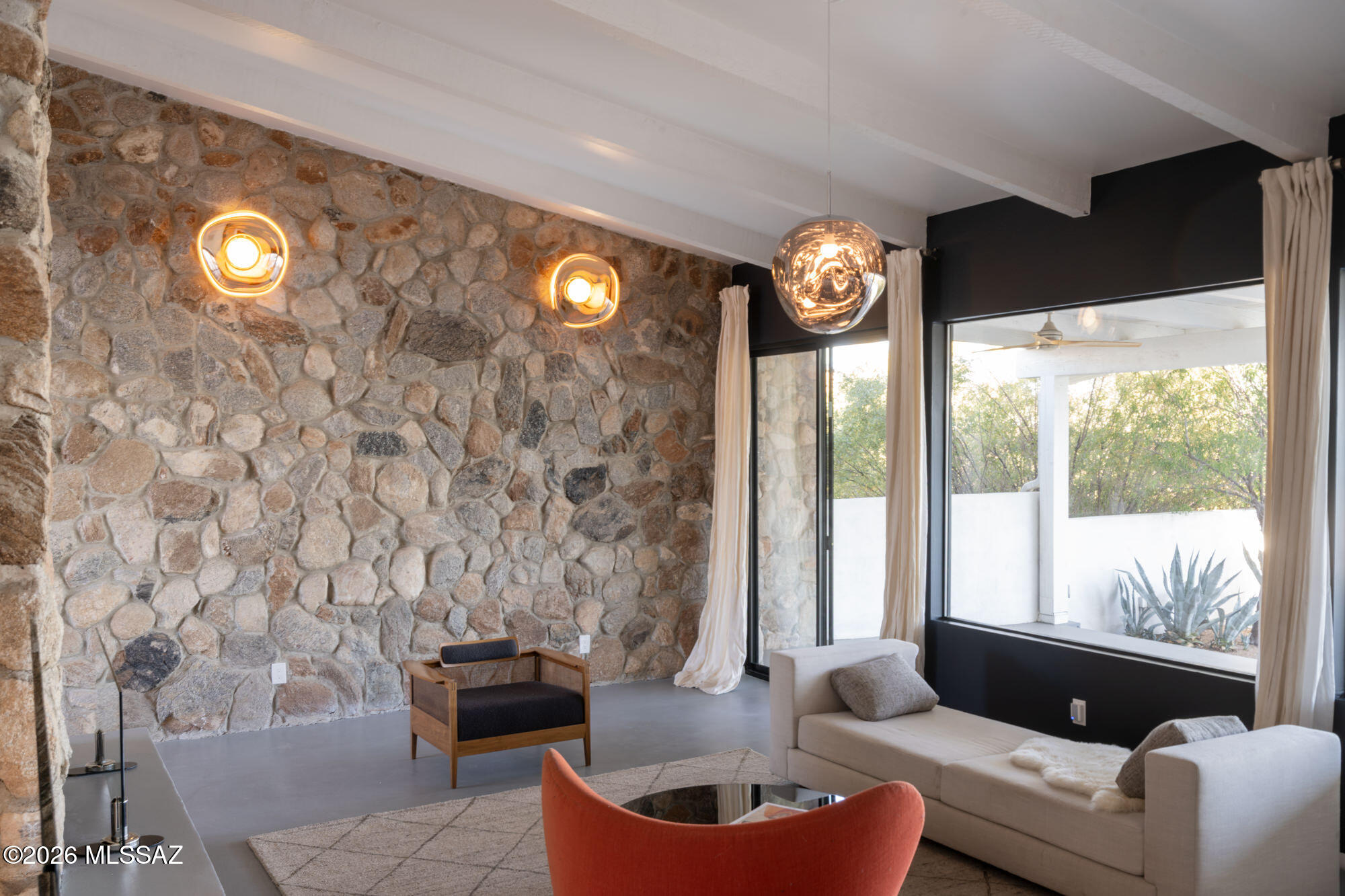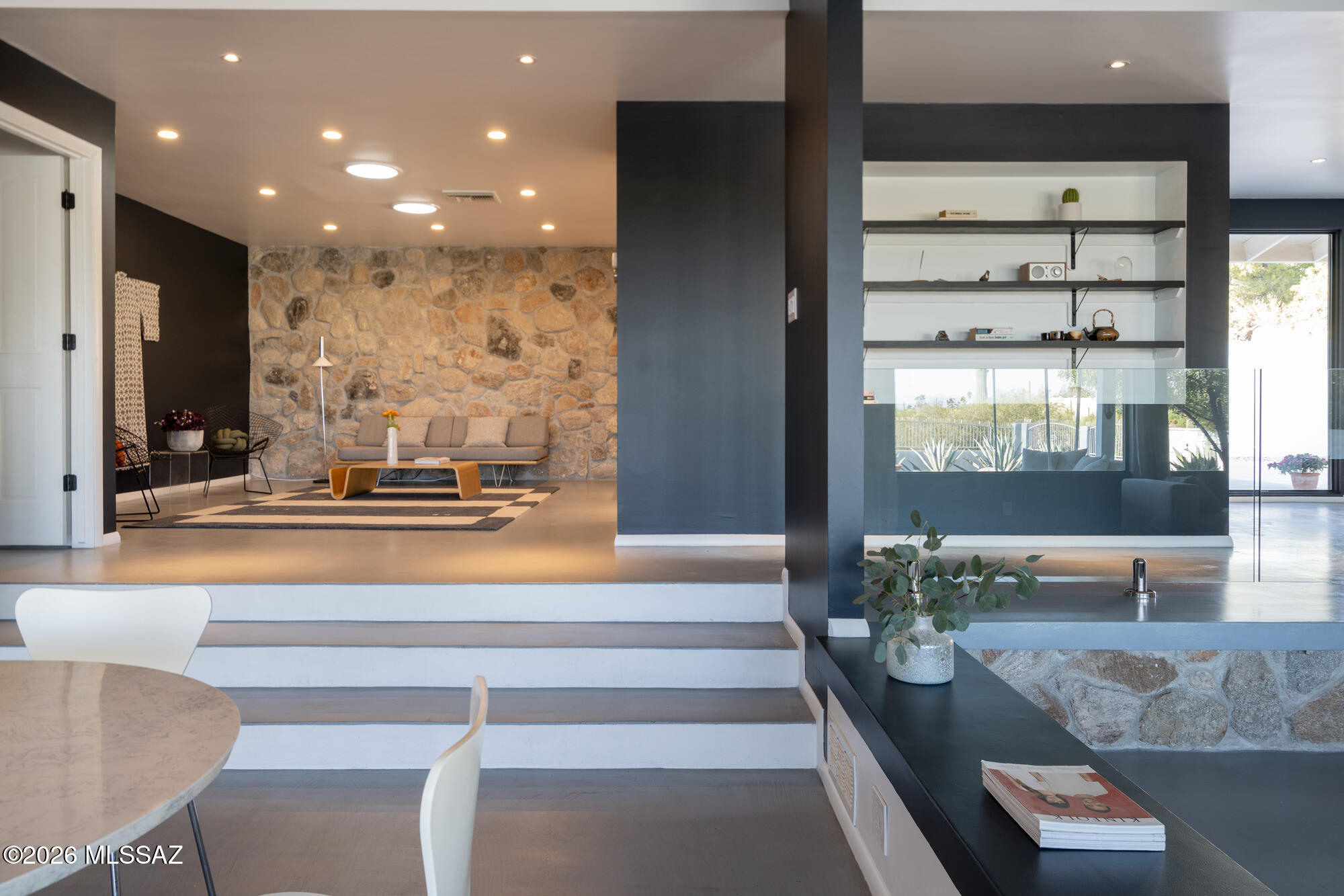 From the main living space, Tucson unfolds in every direction--city lights at night, open sky by day. Vaulted ceilings and expansive walls of glass define the formal living and dining room, extending seamlessly to a deep covered porch, pool, and desert landscape beyond. The boundary between interior and exterior dissolves into a continuous horizon, stretching the full width of the main home. Textured rock walls run throughout, grounding the clean mid-century lines and providing a quiet counterpoint to the light-filled interiors. The floor plan moves with ease from the more formal spaces to a more relaxed family room just off the kitchen--suited for slower mornings and quieter evenings. From the kitchen, front courtyard, and secondary living area, the Santa Catalina Mountains frame the view, catching the last light of the day in long desert sunsets.