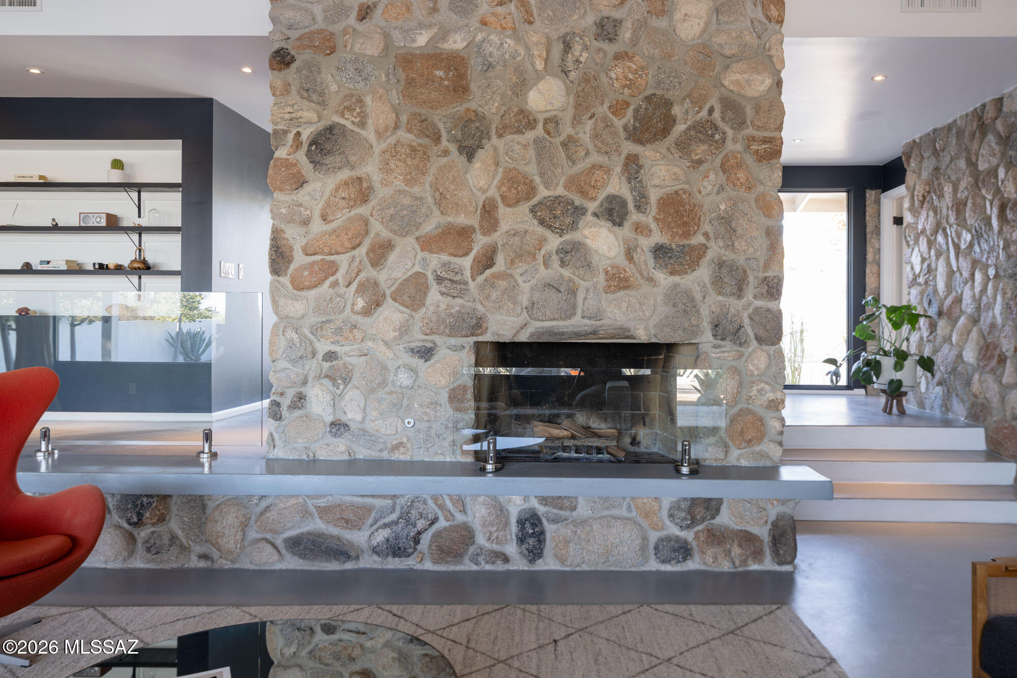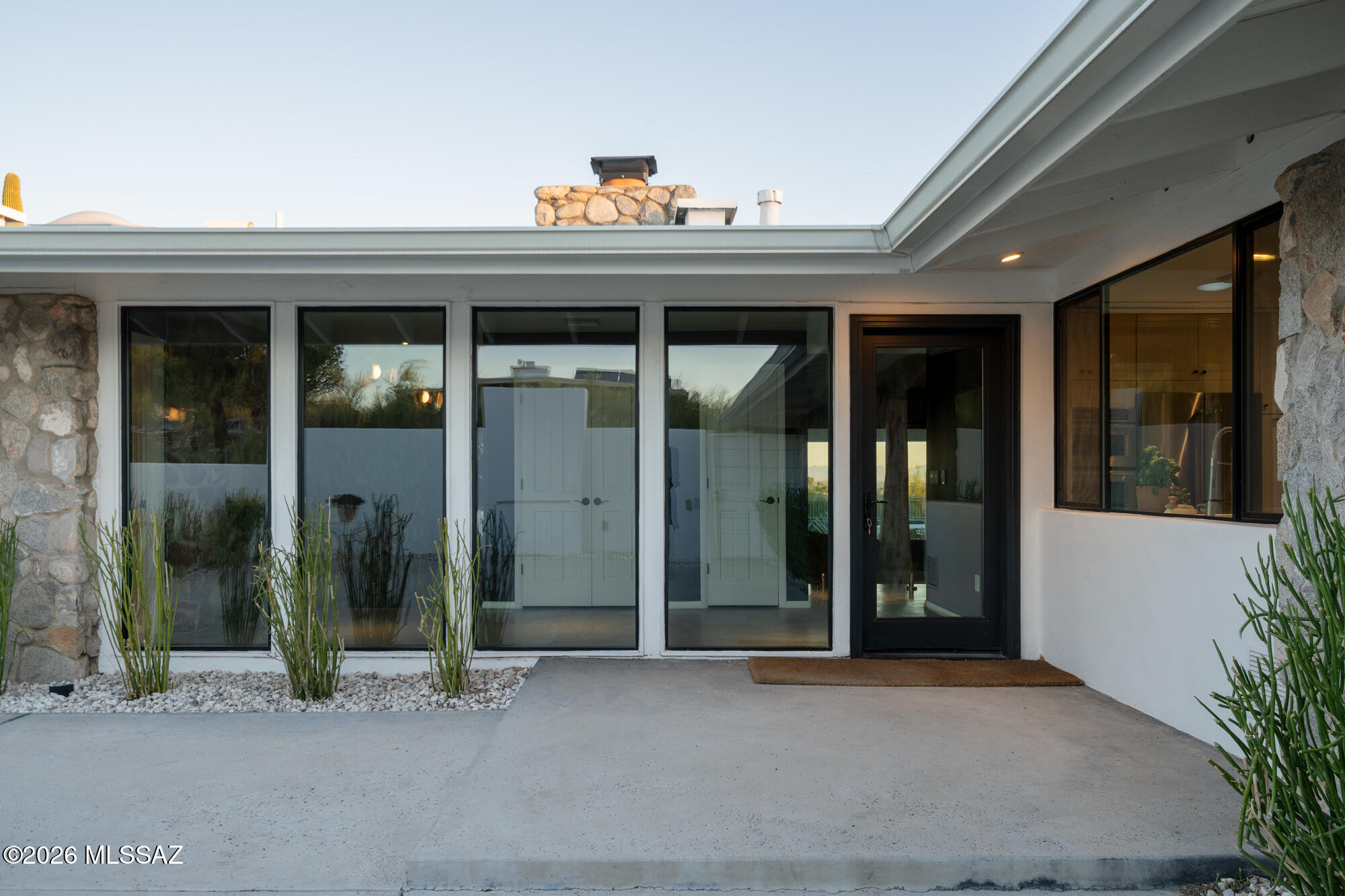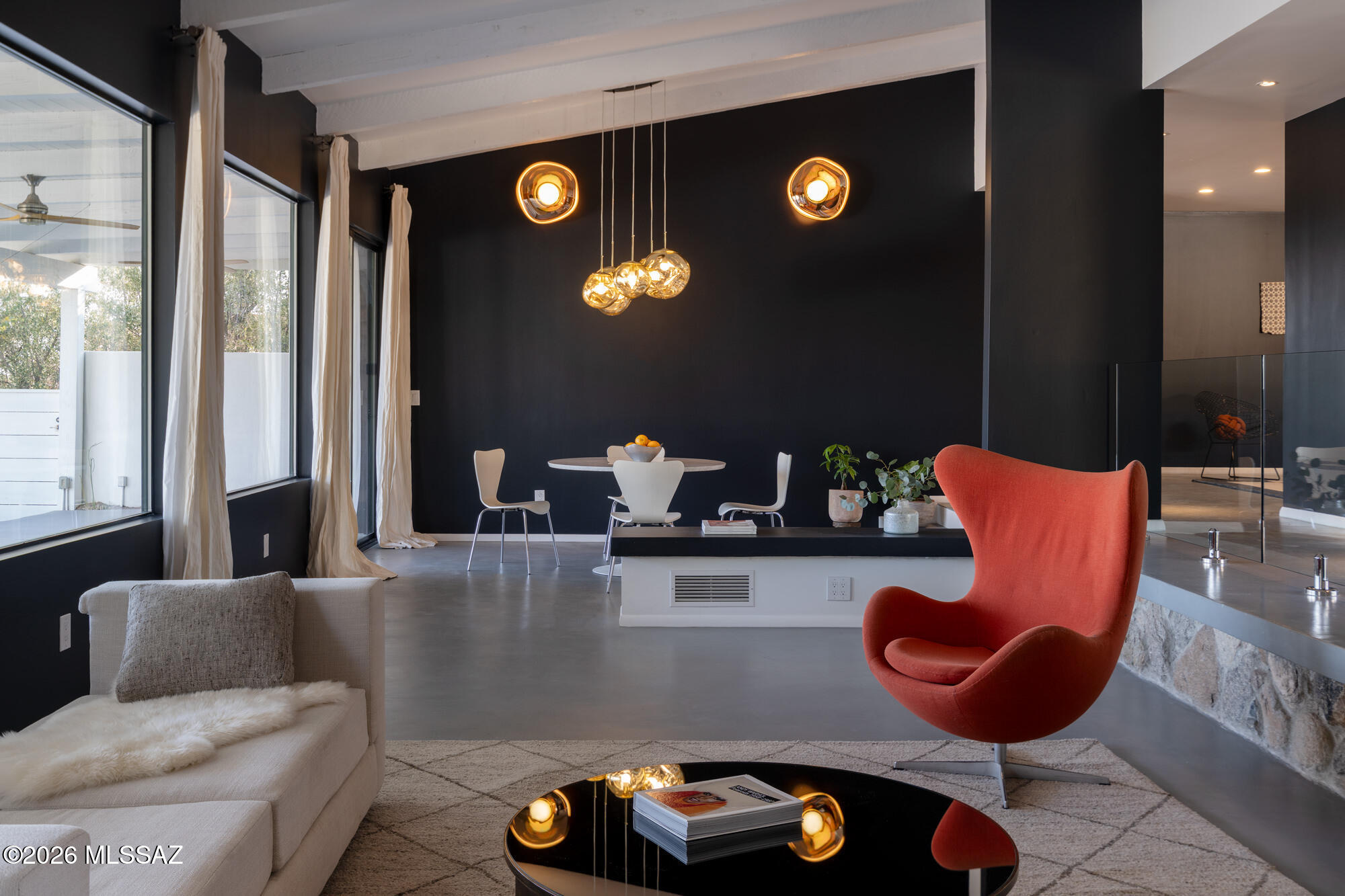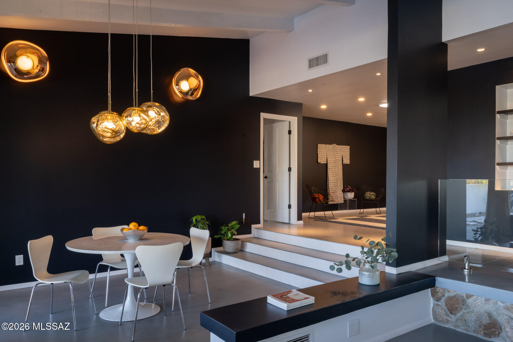 From the main living space, Tucson unfolds in every direction--city lights at night, open sky by day. Vaulted ceilings and expansive walls of glass define the formal living and dining room, extending seamlessly to a deep covered porch, pool, and desert landscape beyond. The boundary between interior and exterior dissolves into a continuous horizon, stretching the full width of the main home. Textured rock walls run throughout, grounding the clean mid-century lines and providing a quiet counterpoint to the light-filled interiors. The floor plan moves with ease from the more formal spaces to a more relaxed family room just off the kitchen--suited for slower mornings and quieter evenings. From the kitchen, front courtyard, and secondary living area, the Santa Catalina Mountains frame the view, catching the last light of the day in long desert sunsets.