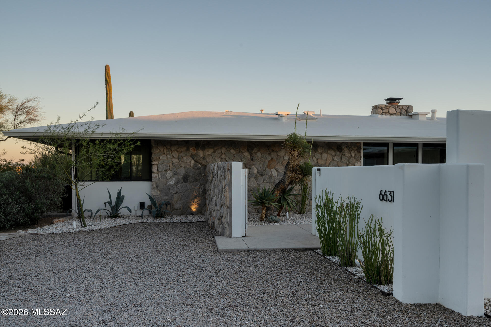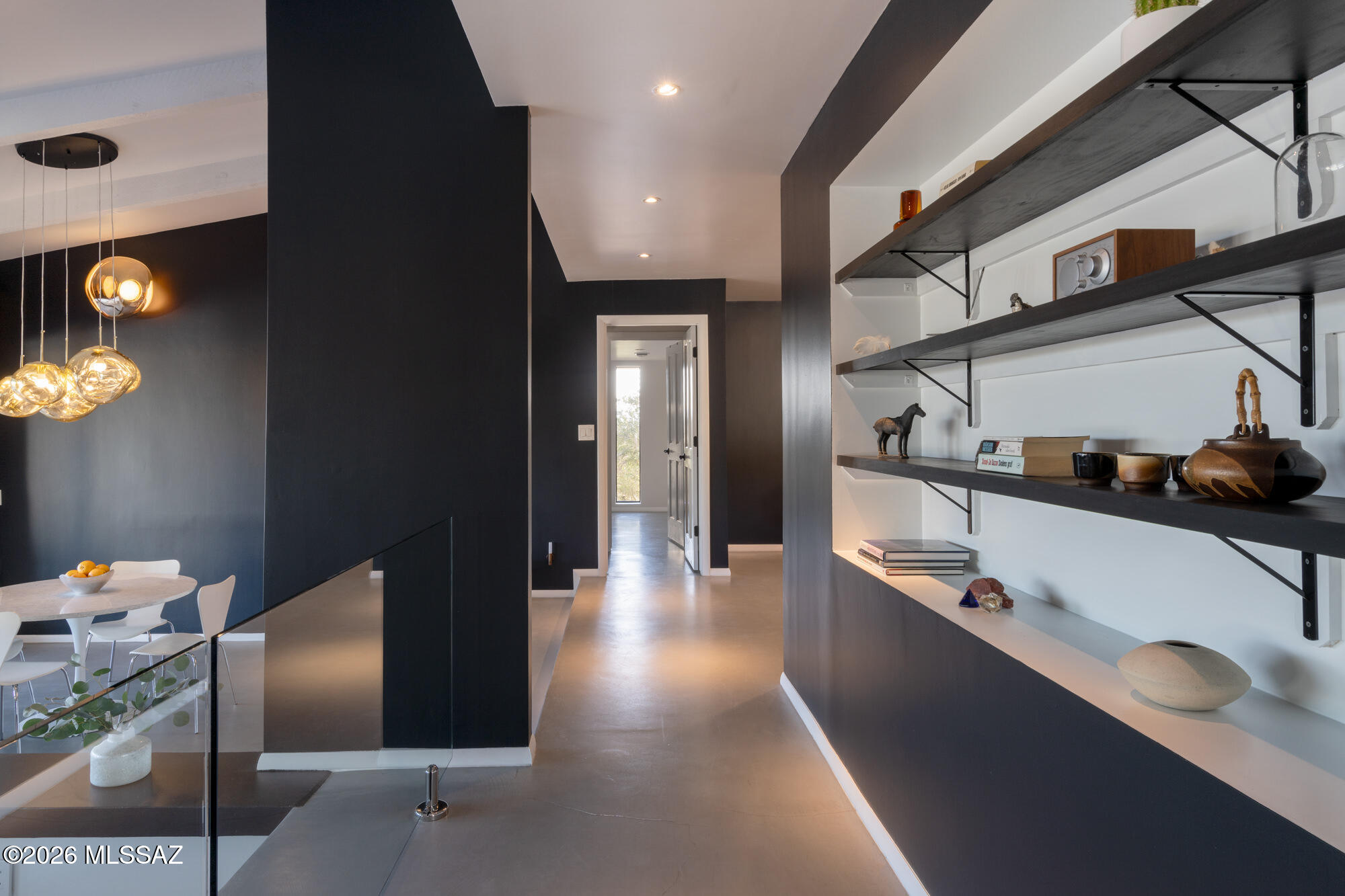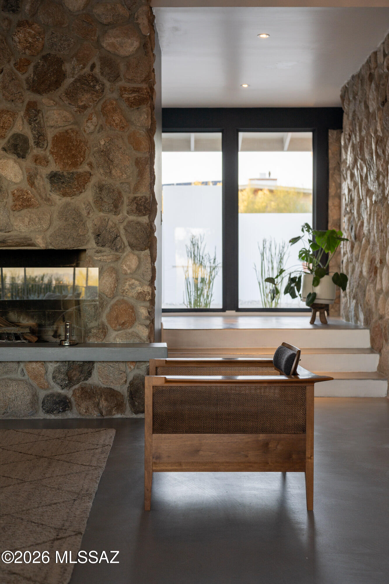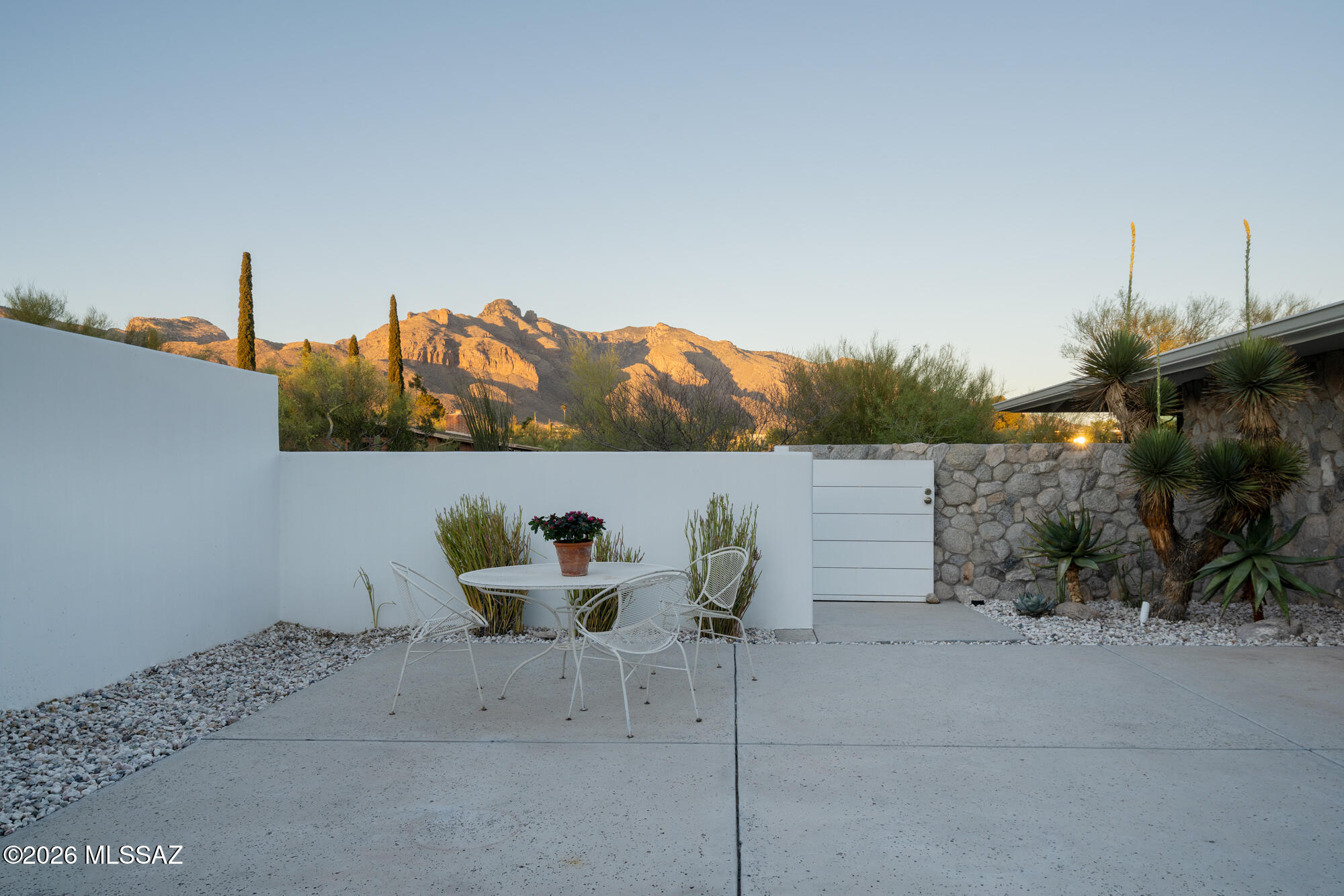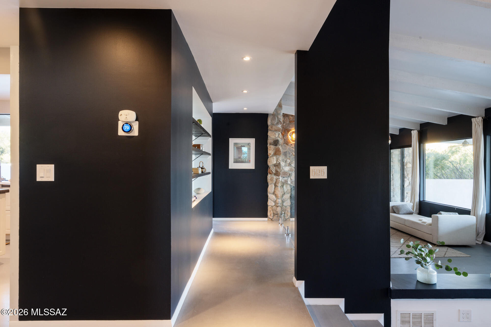 From the main living space, Tucson unfolds in every direction--city lights at night, open sky by day. Vaulted ceilings and expansive walls of glass define the formal living and dining room, extending seamlessly to a deep covered porch, pool, and desert landscape beyond. The boundary between interior and exterior dissolves into a continuous horizon, stretching the full width of the main home. Textured rock walls run throughout, grounding the clean mid-century lines and providing a quiet counterpoint to the light-filled interiors. The floor plan moves with ease from the more formal spaces to a more relaxed family room just off the kitchen--suited for slower mornings and quieter evenings. From the kitchen, front courtyard, and secondary living area, the Santa Catalina Mountains frame the view, catching the last light of the day in long desert sunsets.