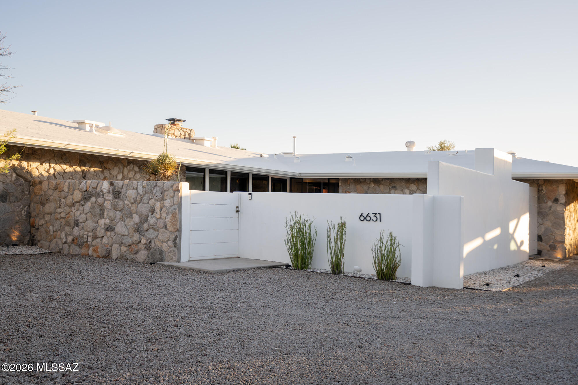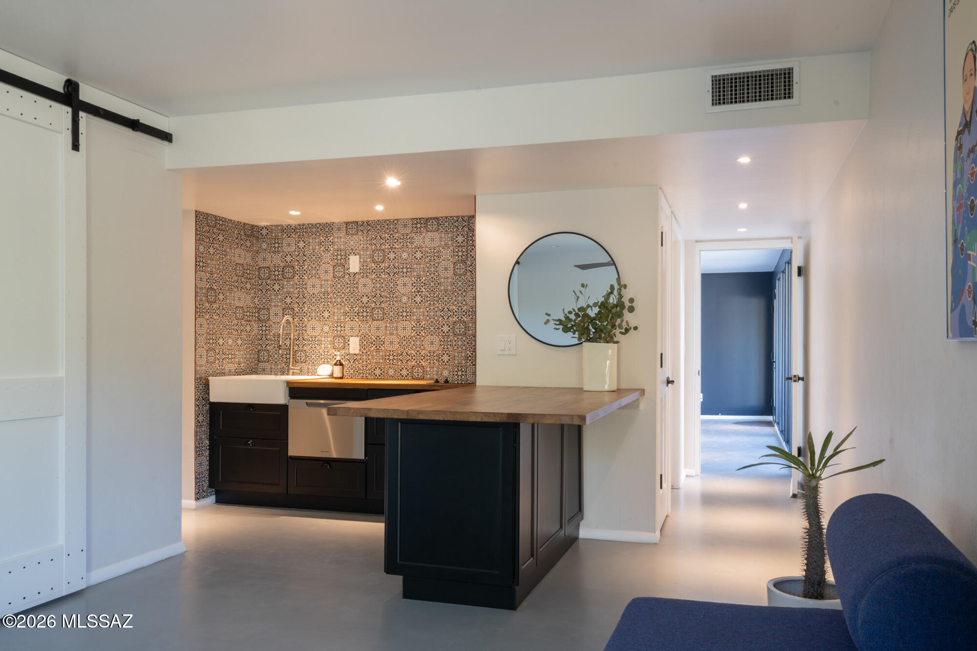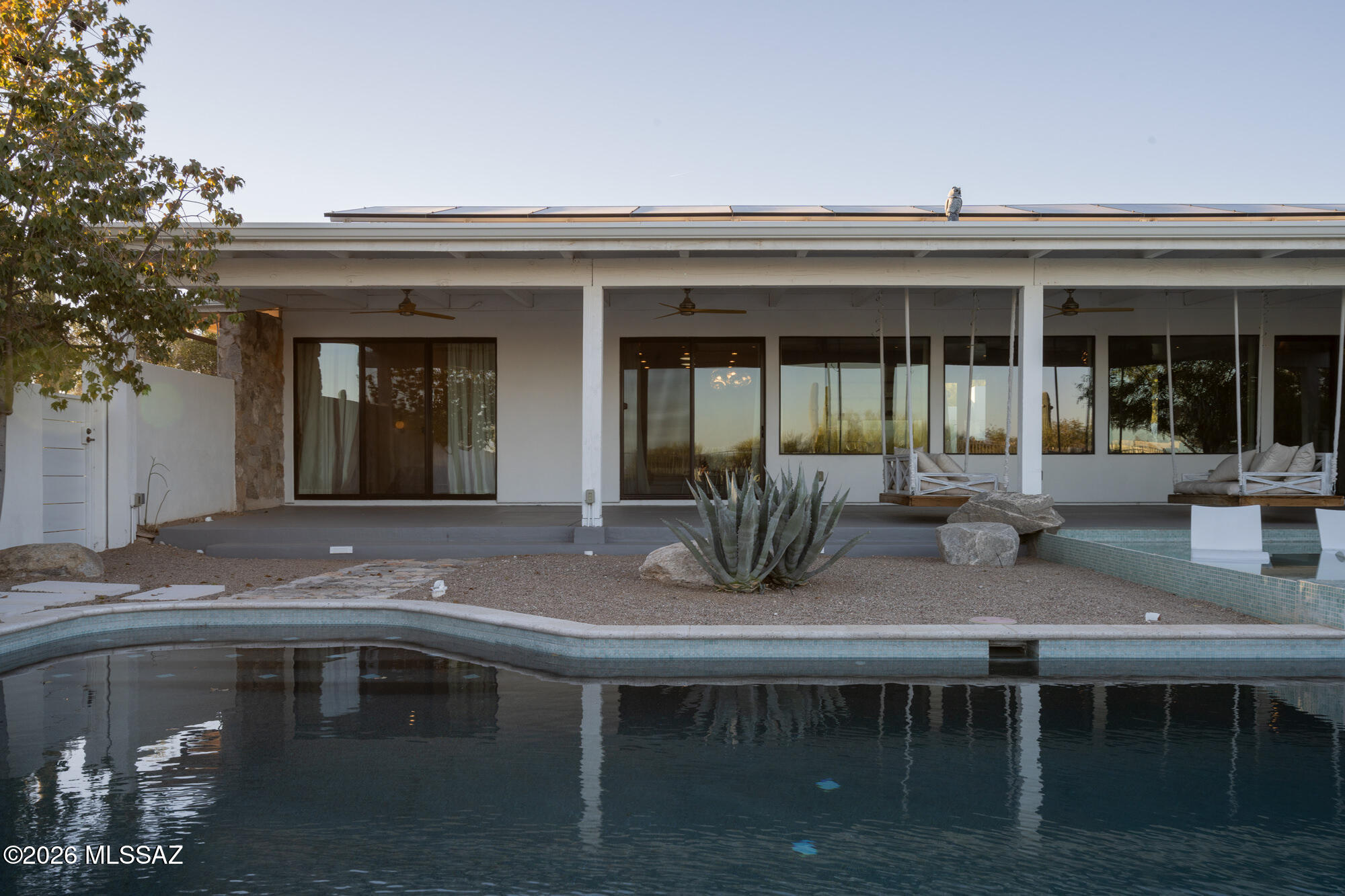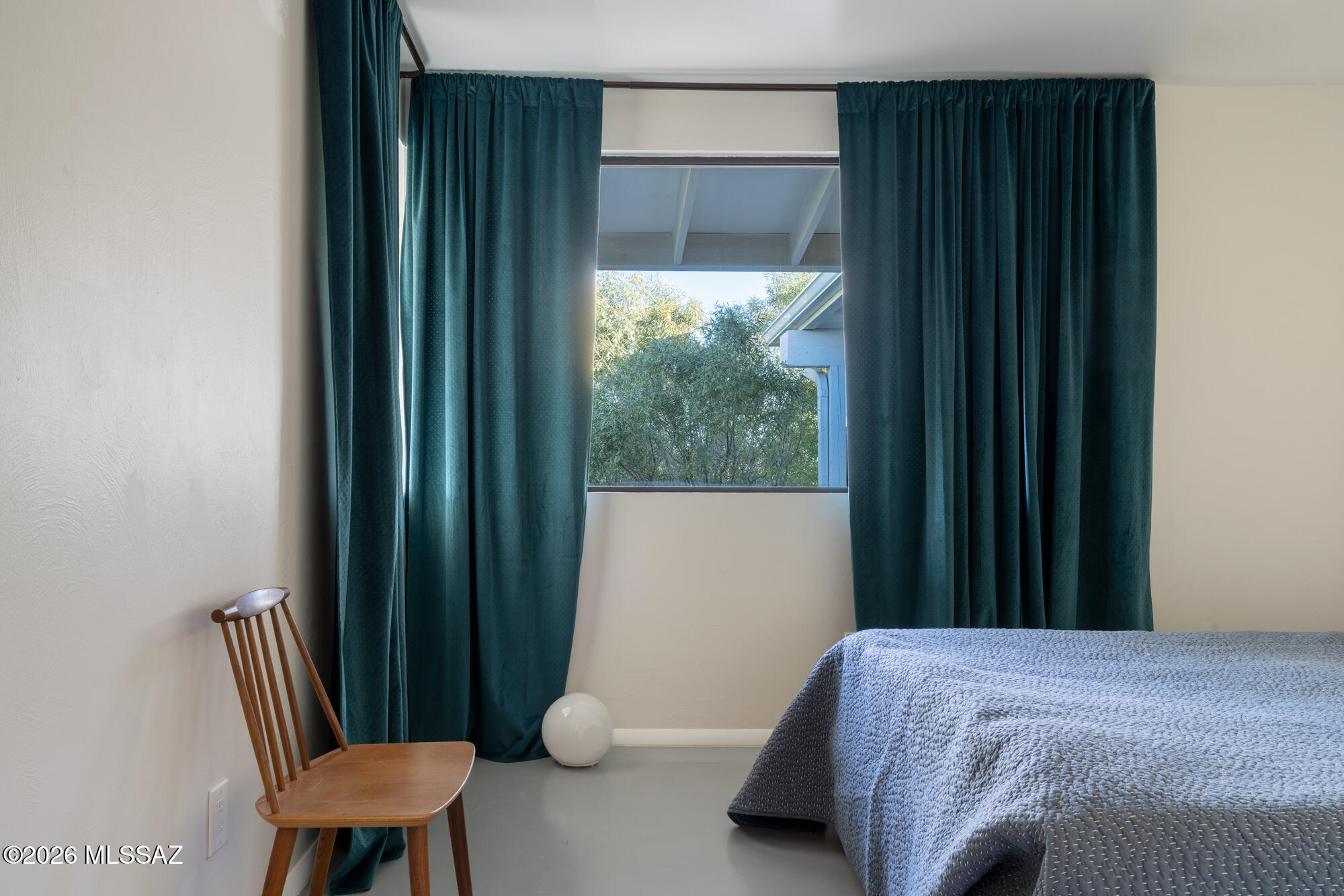 From the main living space, Tucson unfolds in every direction--city lights at night, open sky by day. Vaulted ceilings and expansive walls of glass define the formal living and dining room, extending seamlessly to a deep covered porch, pool, and desert landscape beyond. The boundary between interior and exterior dissolves into a continuous horizon, stretching the full width of the main home. Textured rock walls run throughout, grounding the clean mid-century lines and providing a quiet counterpoint to the light-filled interiors. The floor plan moves with ease from the more formal spaces to a more relaxed family room just off the kitchen--suited for slower mornings and quieter evenings. From the kitchen, front courtyard, and secondary living area, the Santa Catalina Mountains frame the view, catching the last light of the day in long desert sunsets.